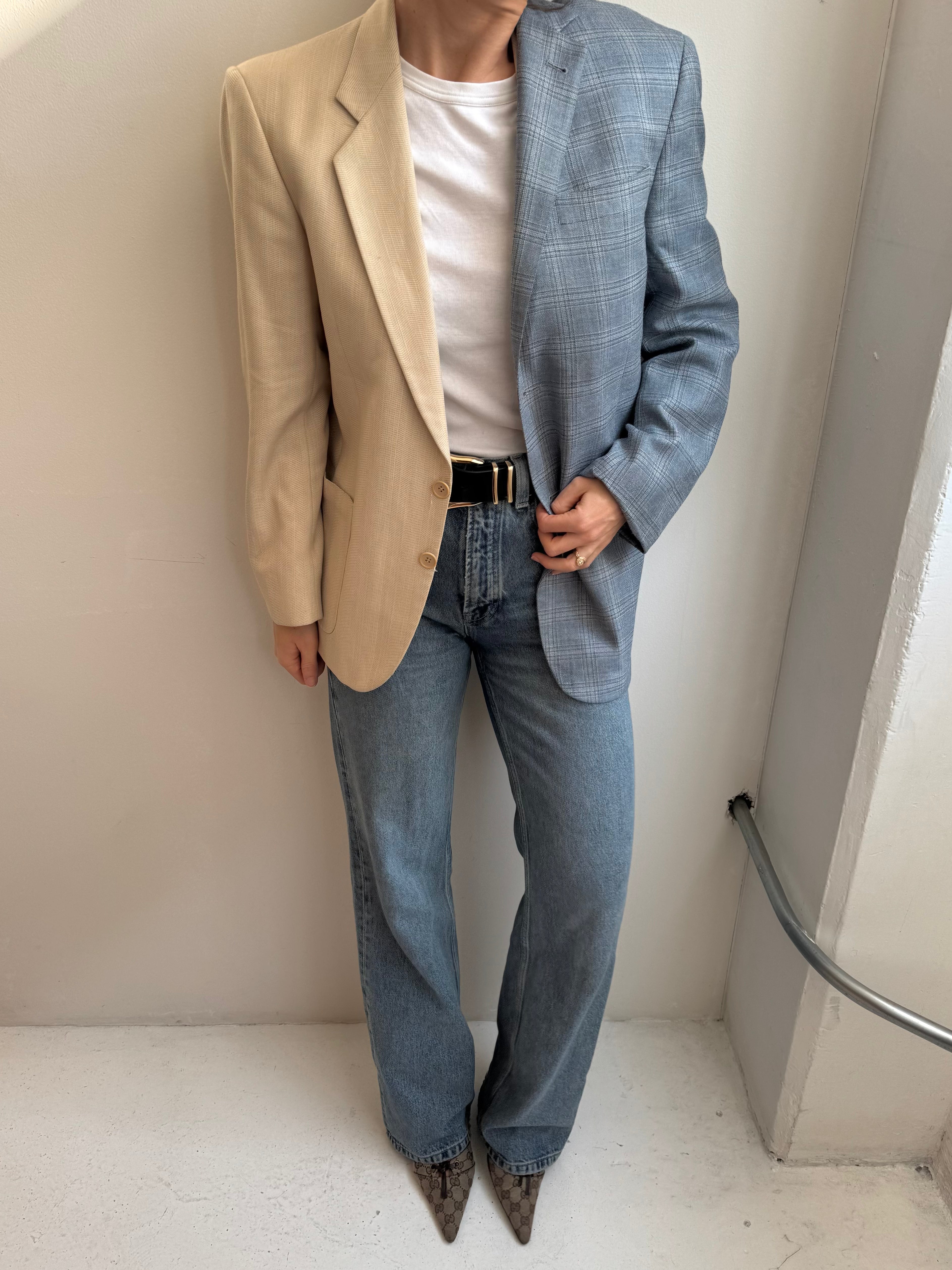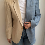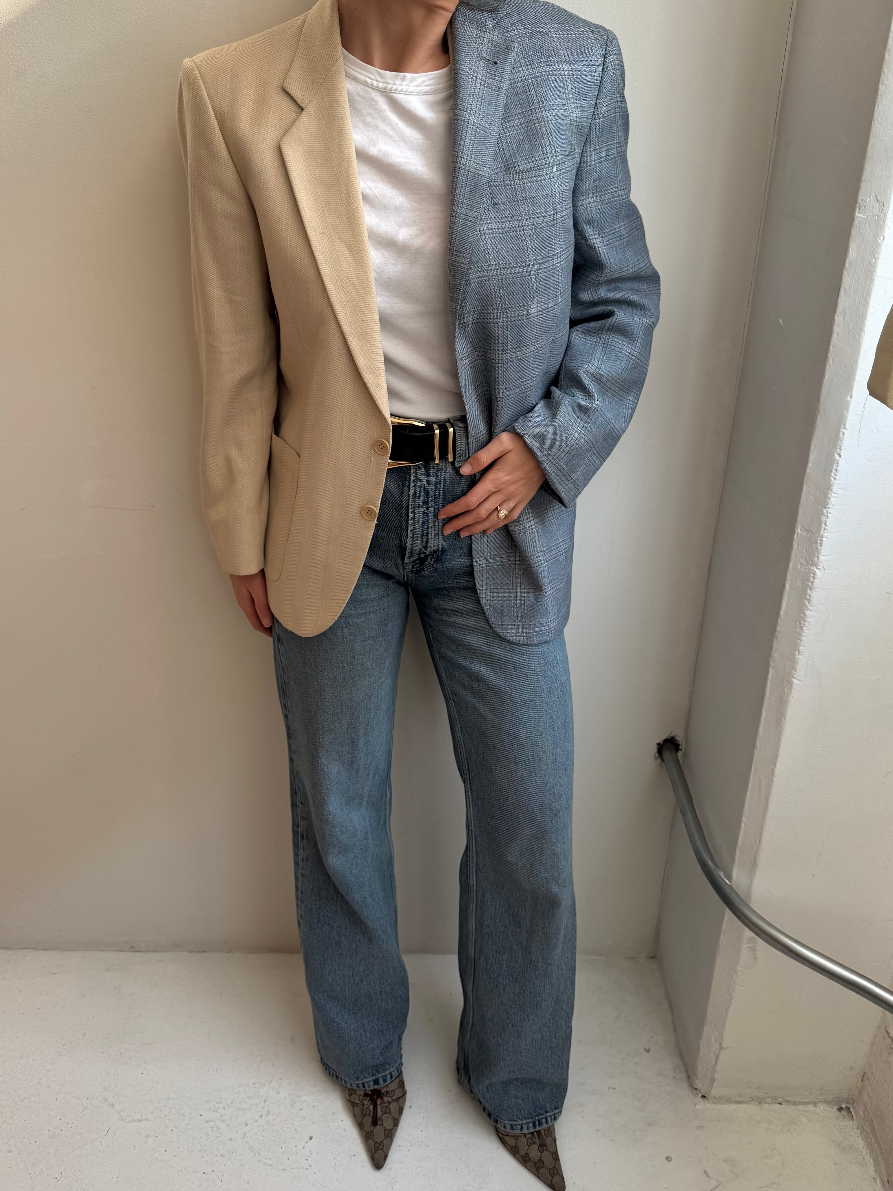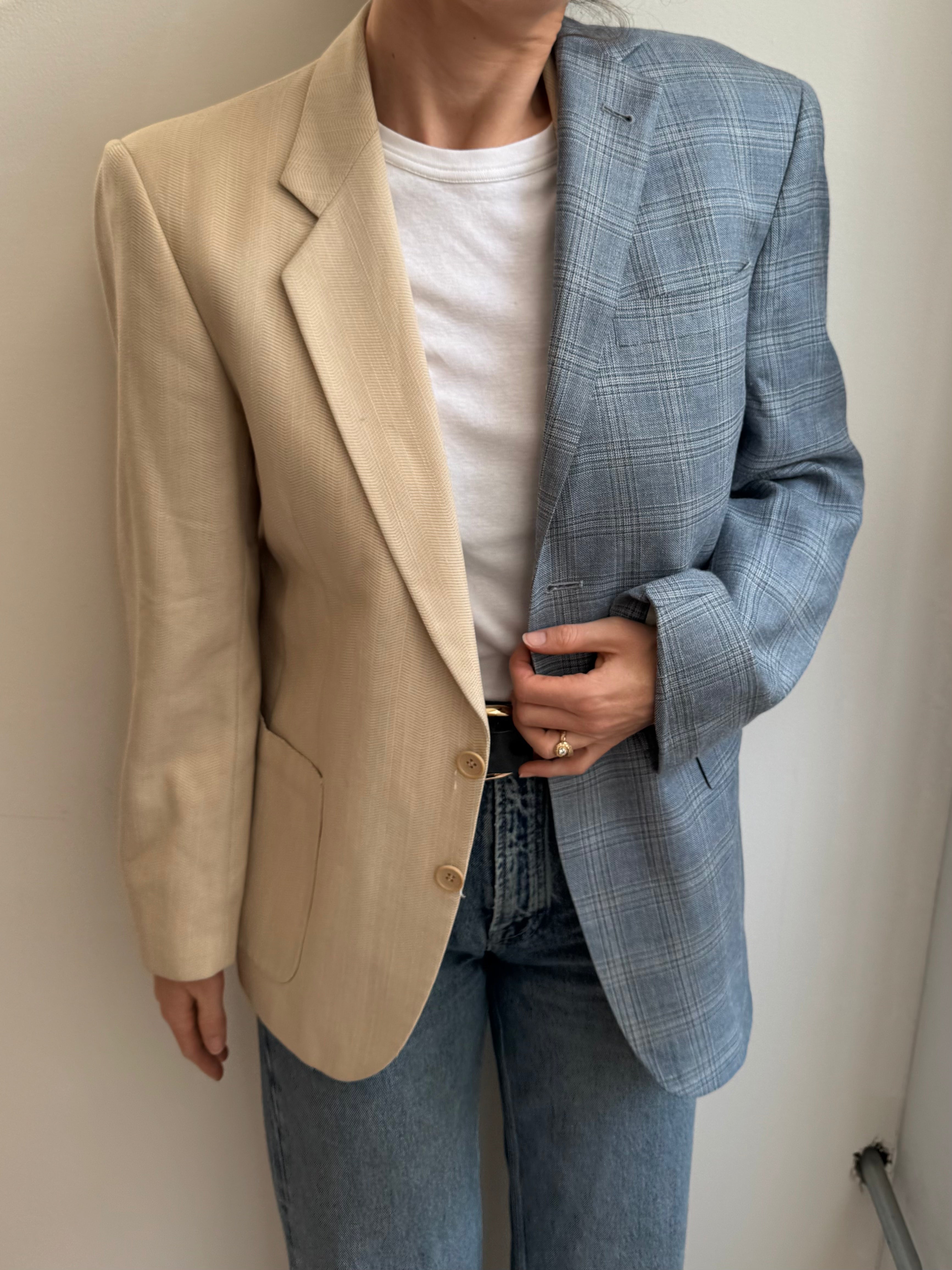 A match made in heaven. Two carefully sourced vintage blazers, made into one, adding a twist to the classic and timeless oversized blazer. Perfect for all occasions and always super versatile. Wear it with jeans or on its own, daytime or evening. Carefully curated, tailored and dry cleaned. Beautiful quality, and always made from silk, cashmere, cotton or wool. The sewing has been done well, however there may be slight differences in length/shoulder, as the jacket is made from two recycled blazers.