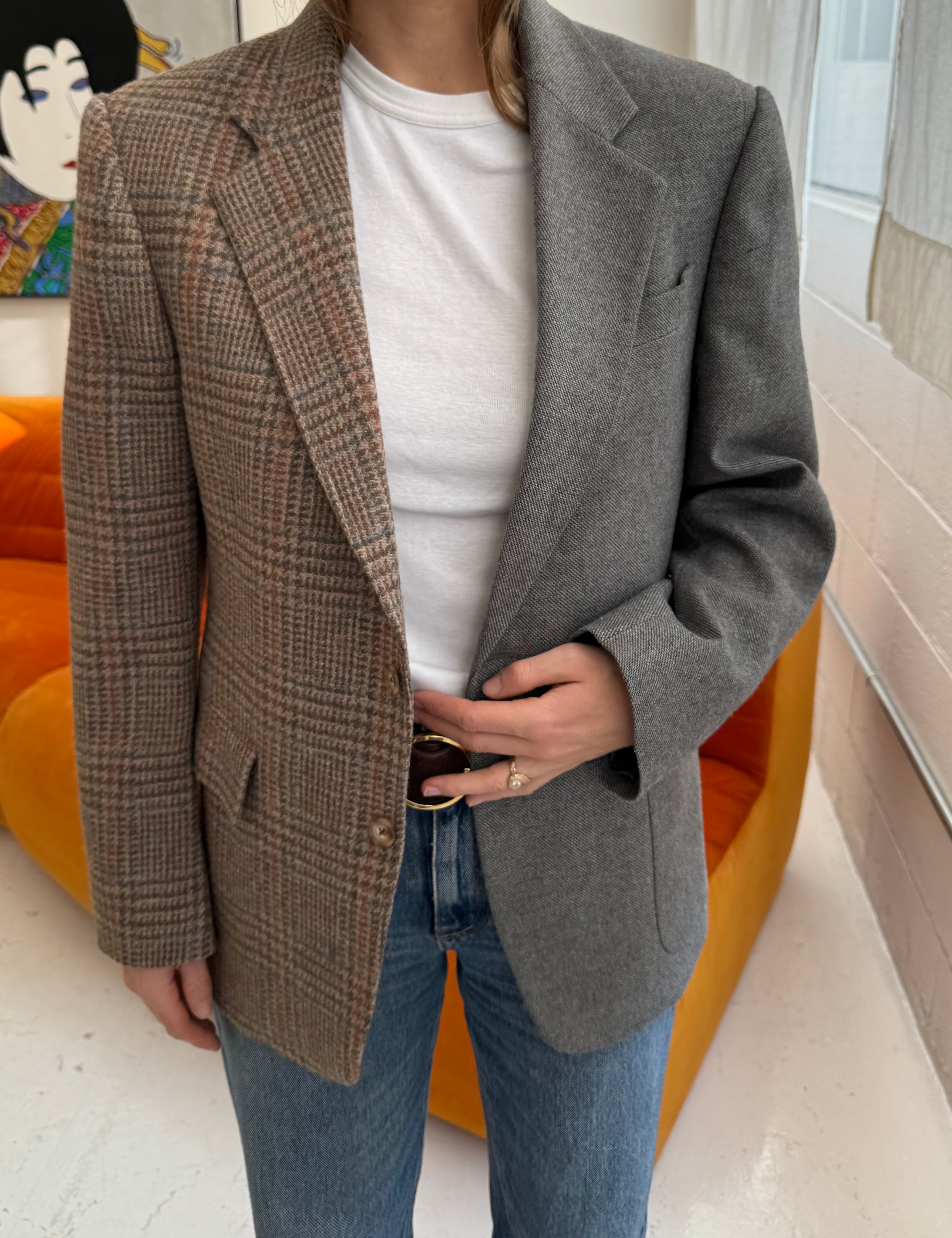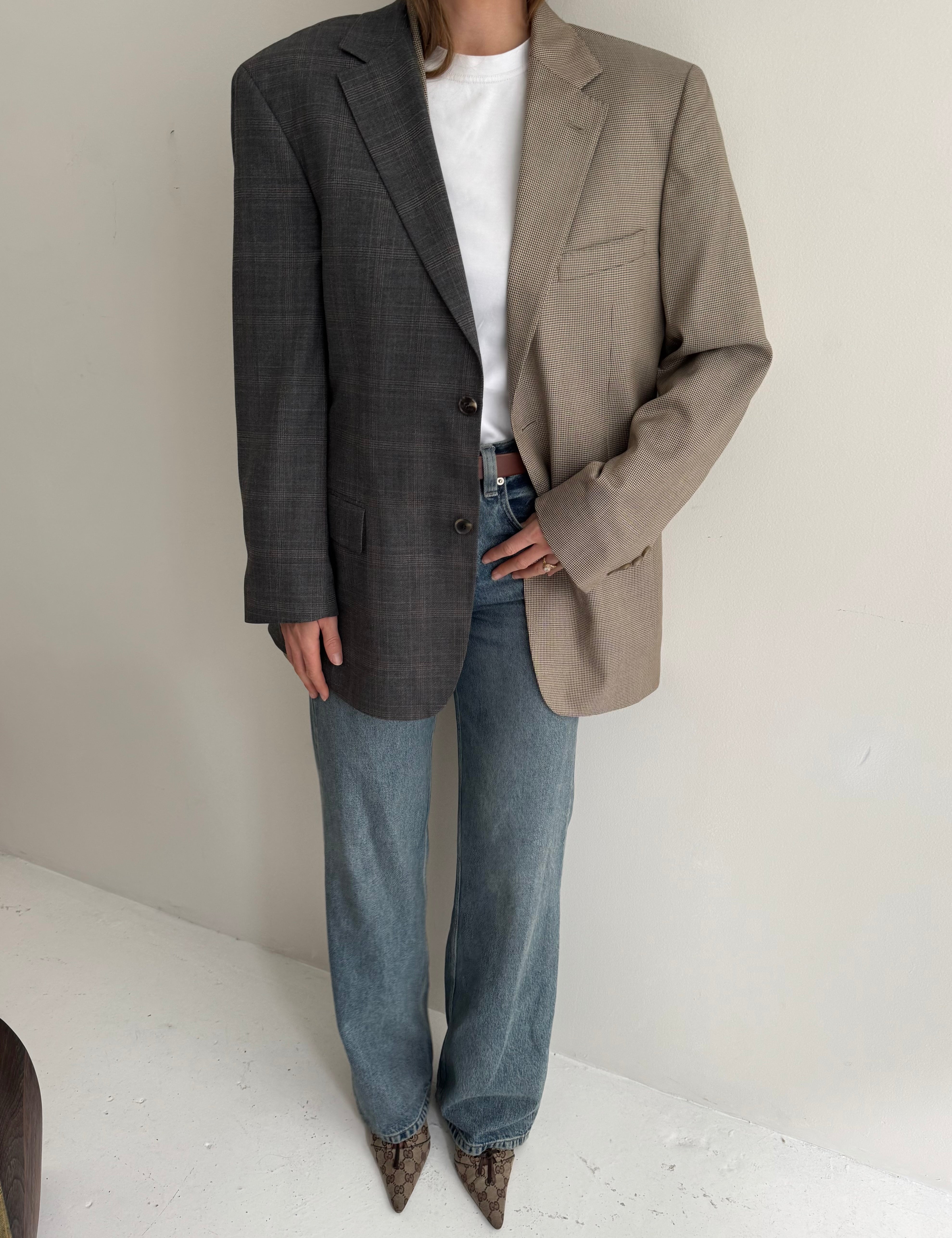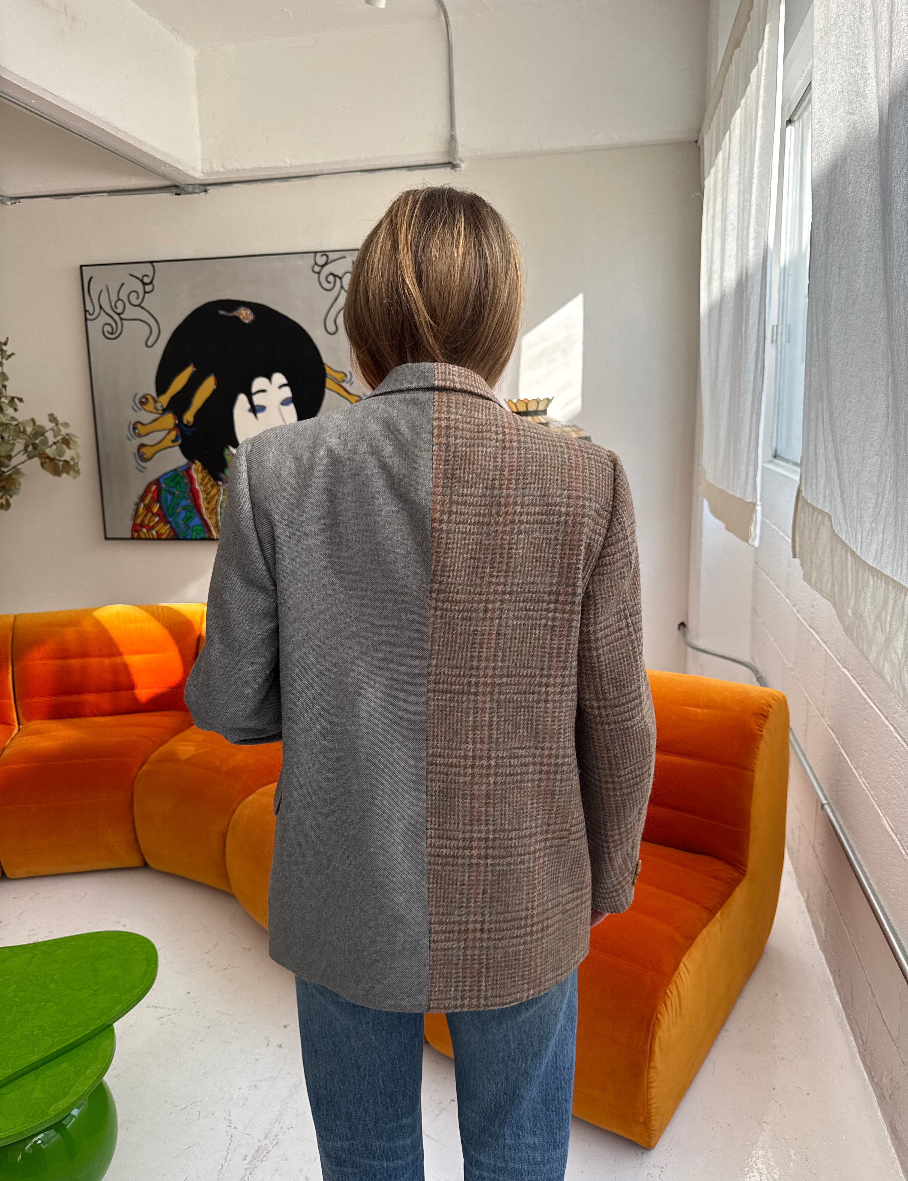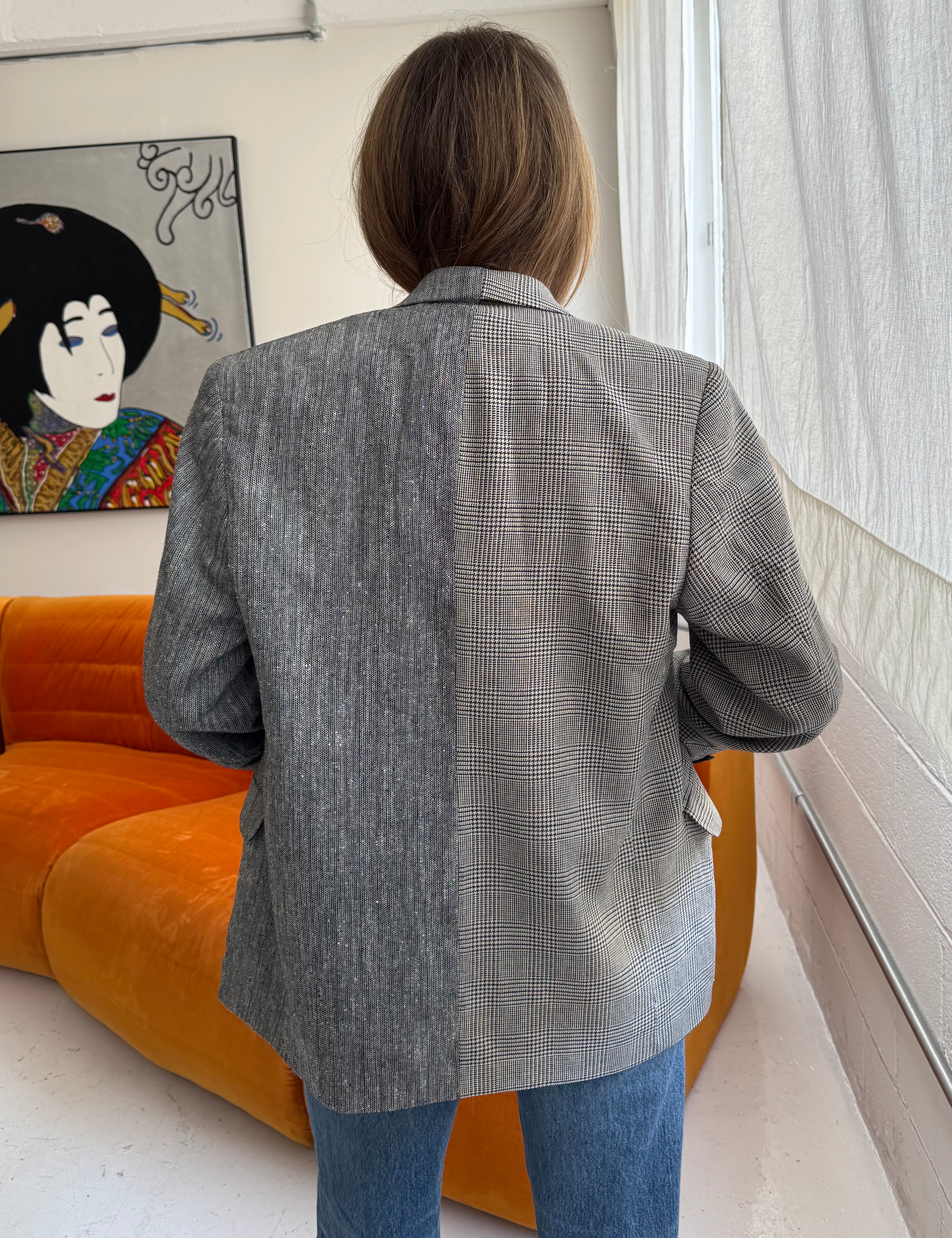 Grey plaid and houndstooth contrasted blazer