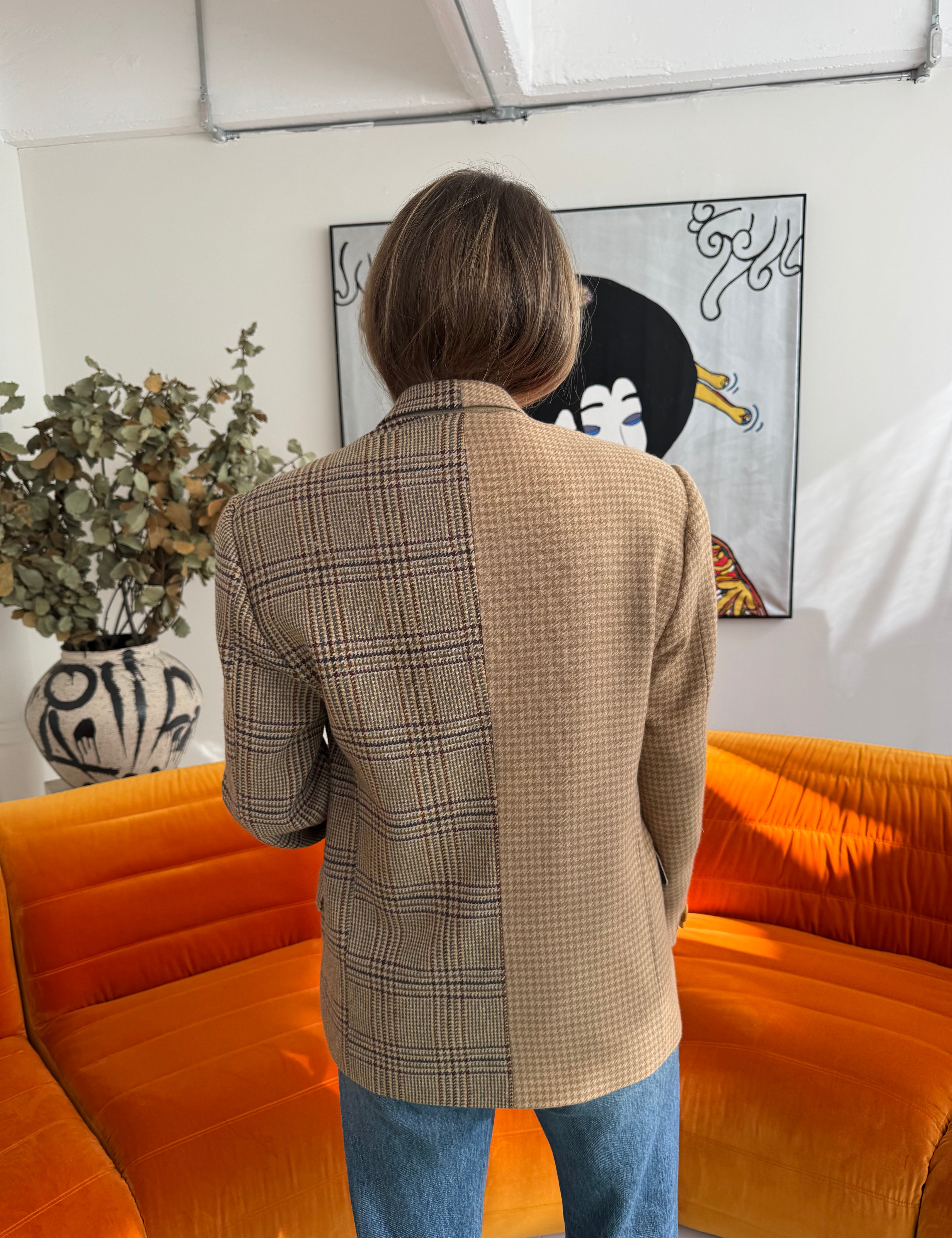 Contrasted blazer in brown herringbone and plaid