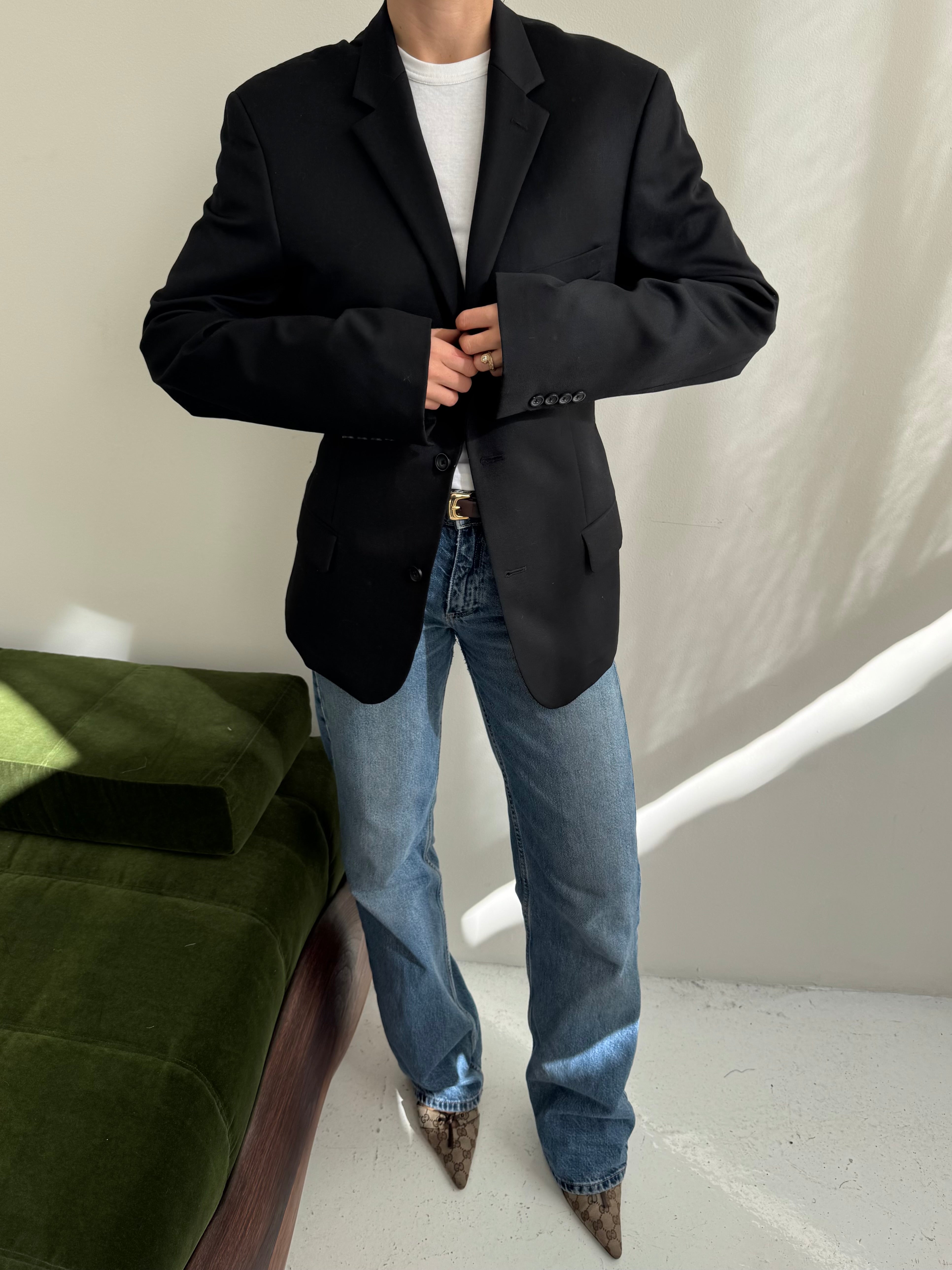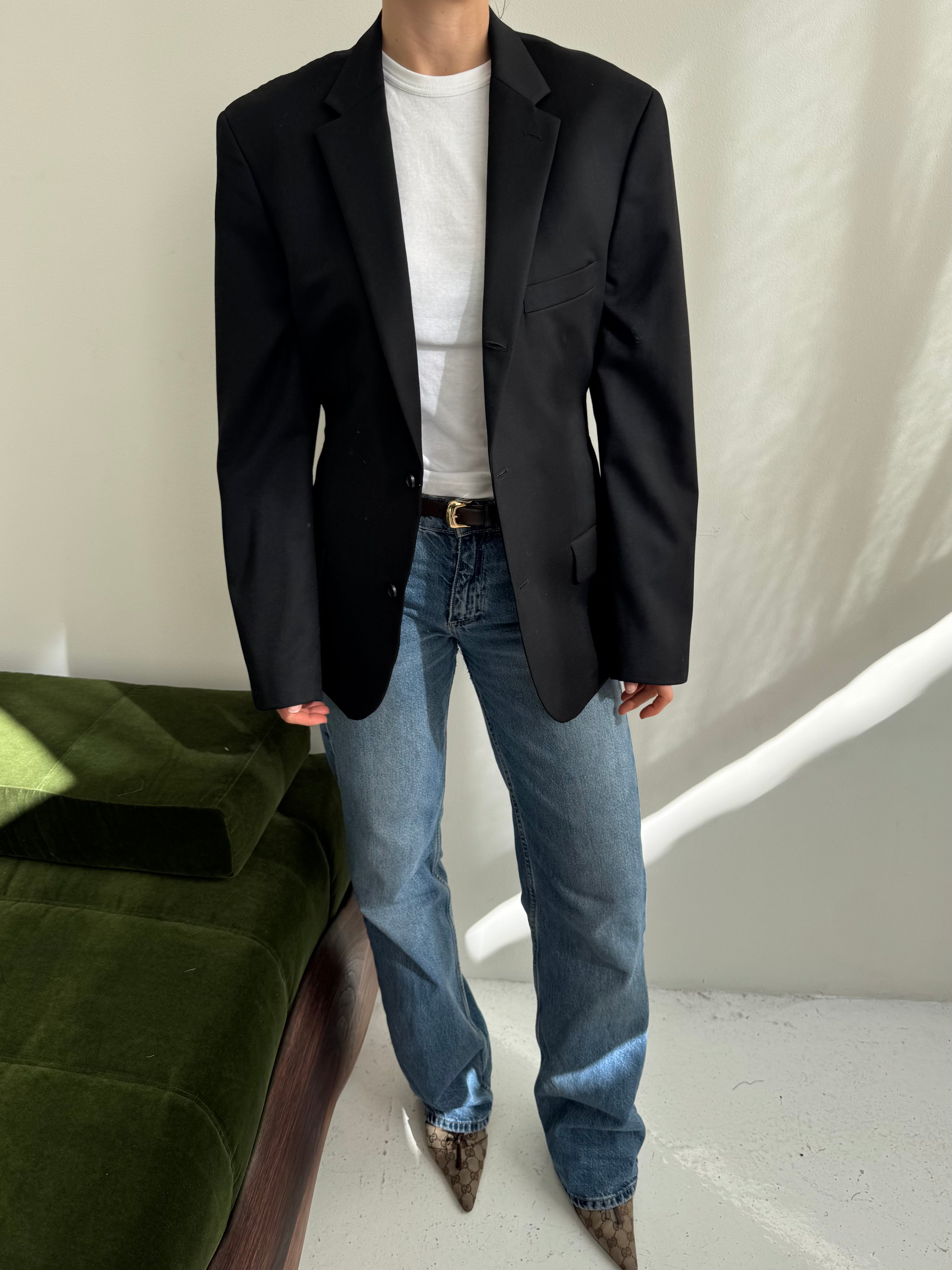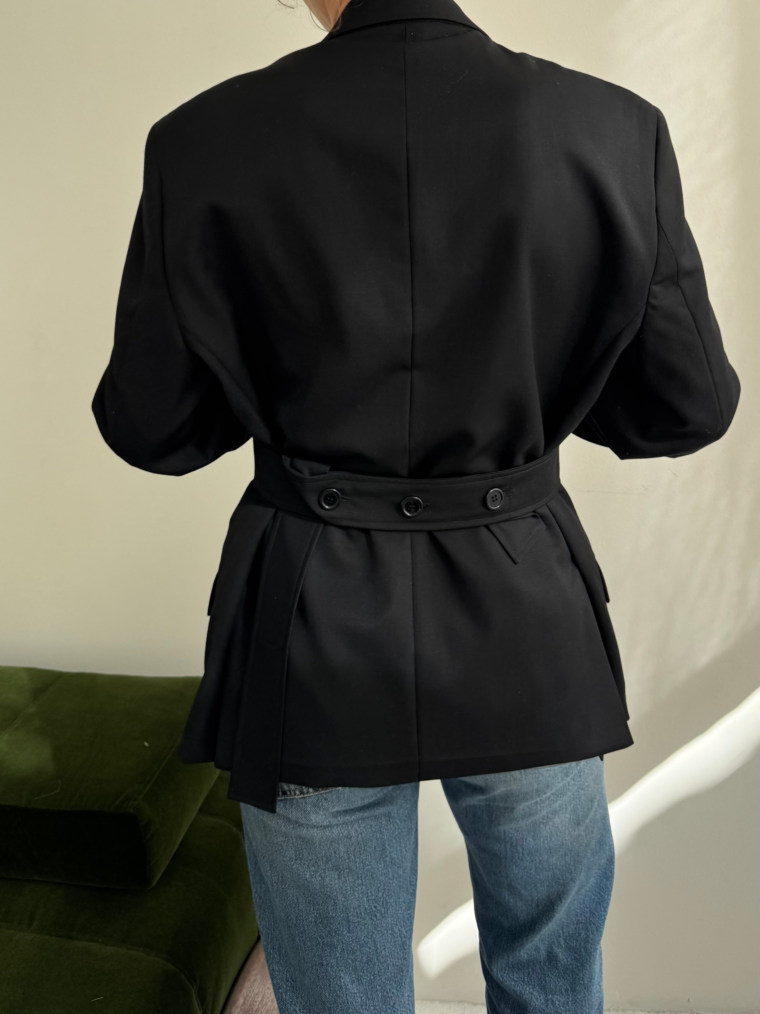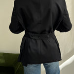 A contemporary twist to a belted jacket. Oversized shoulders, and a waist that can be worn cinched or relaxed. The collar can be buttoned up and worn