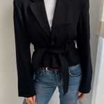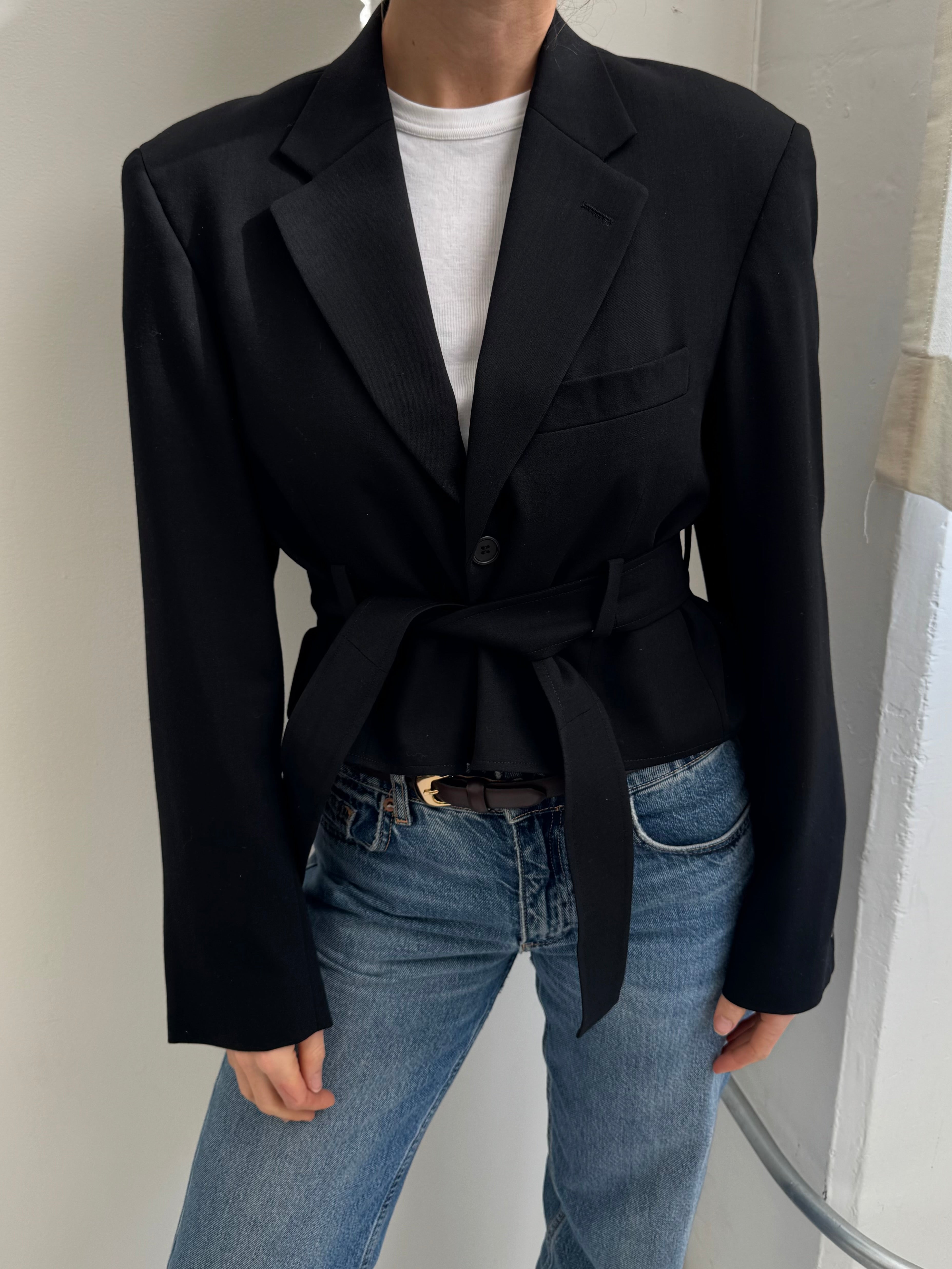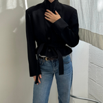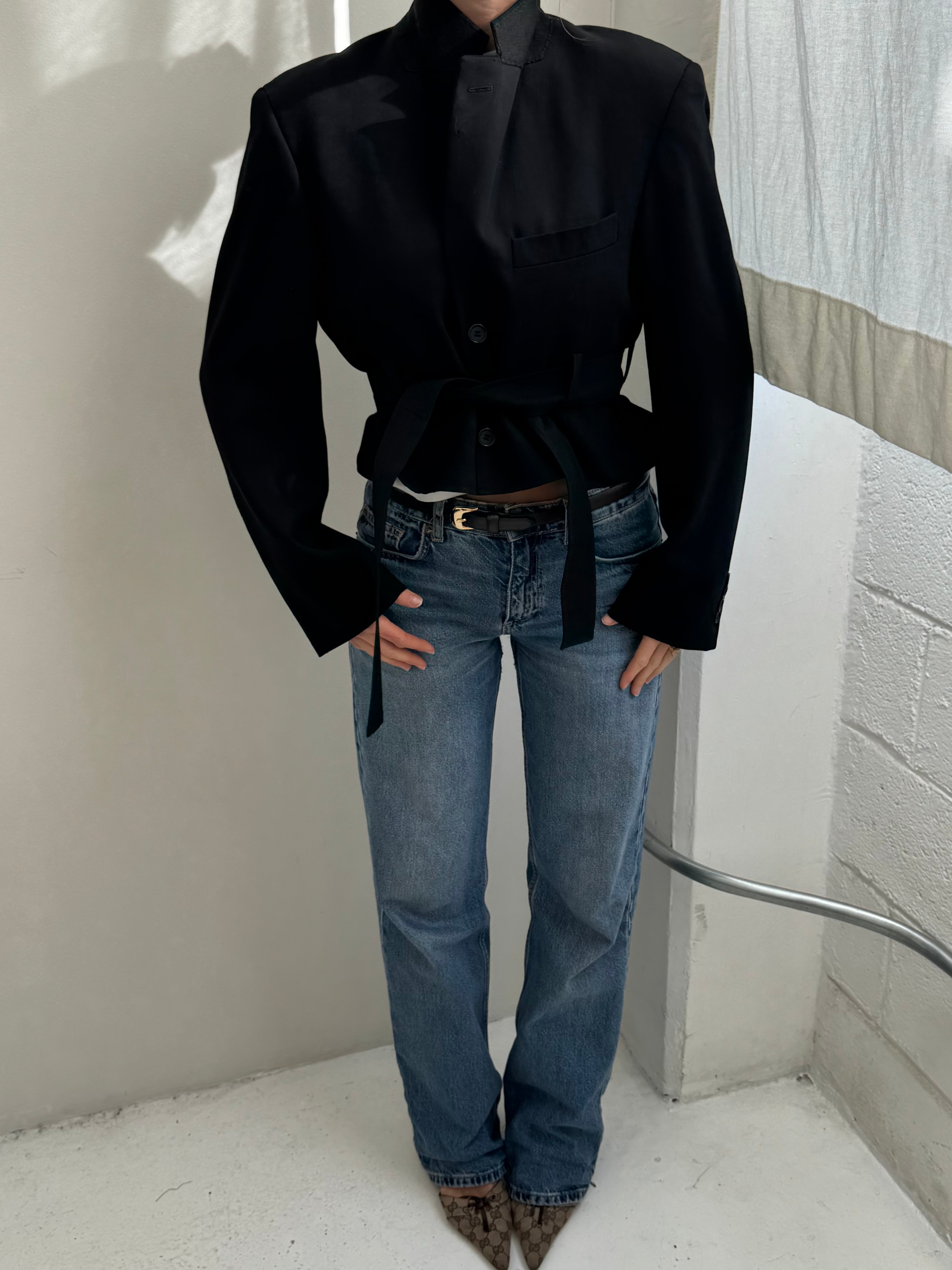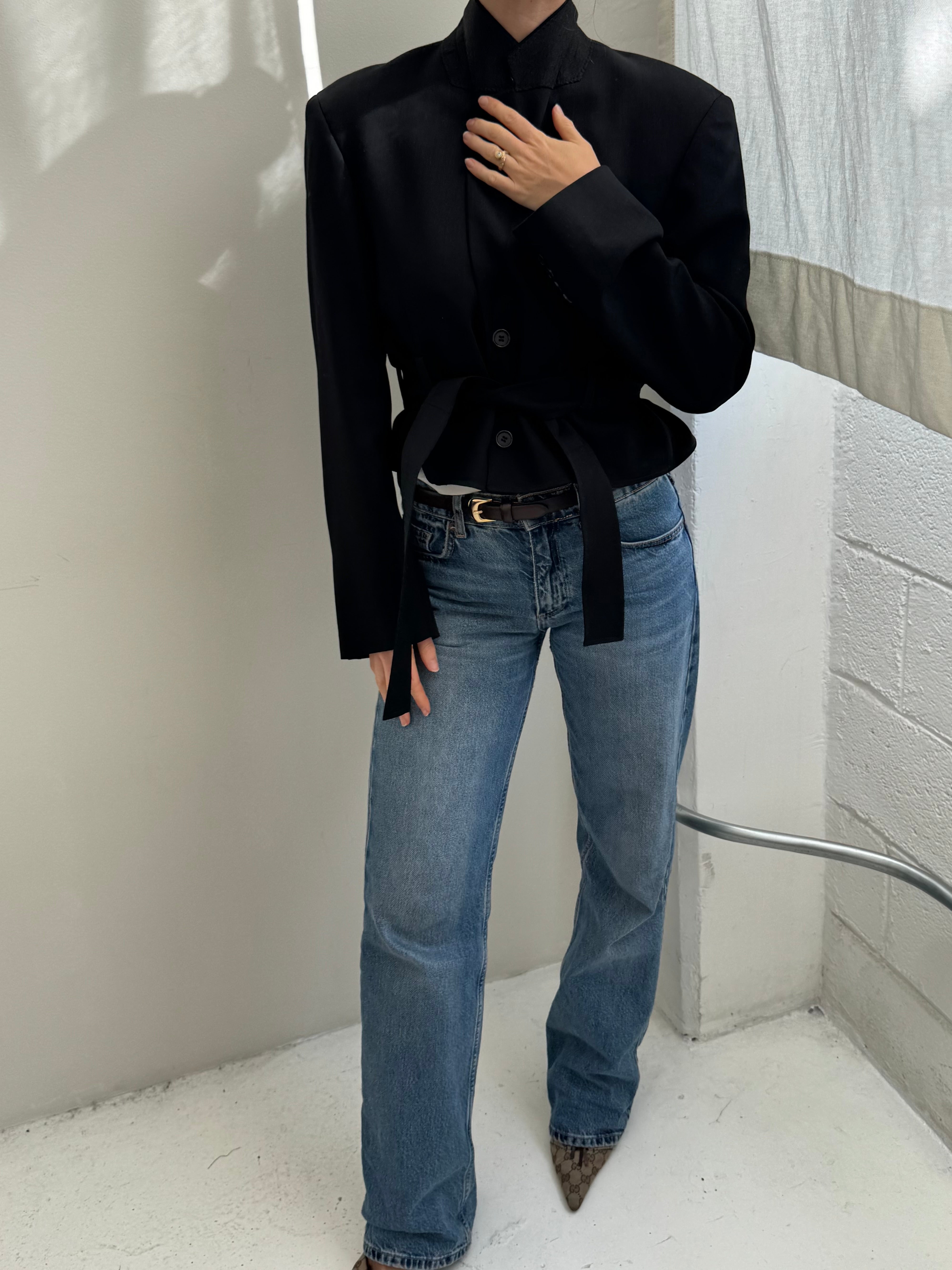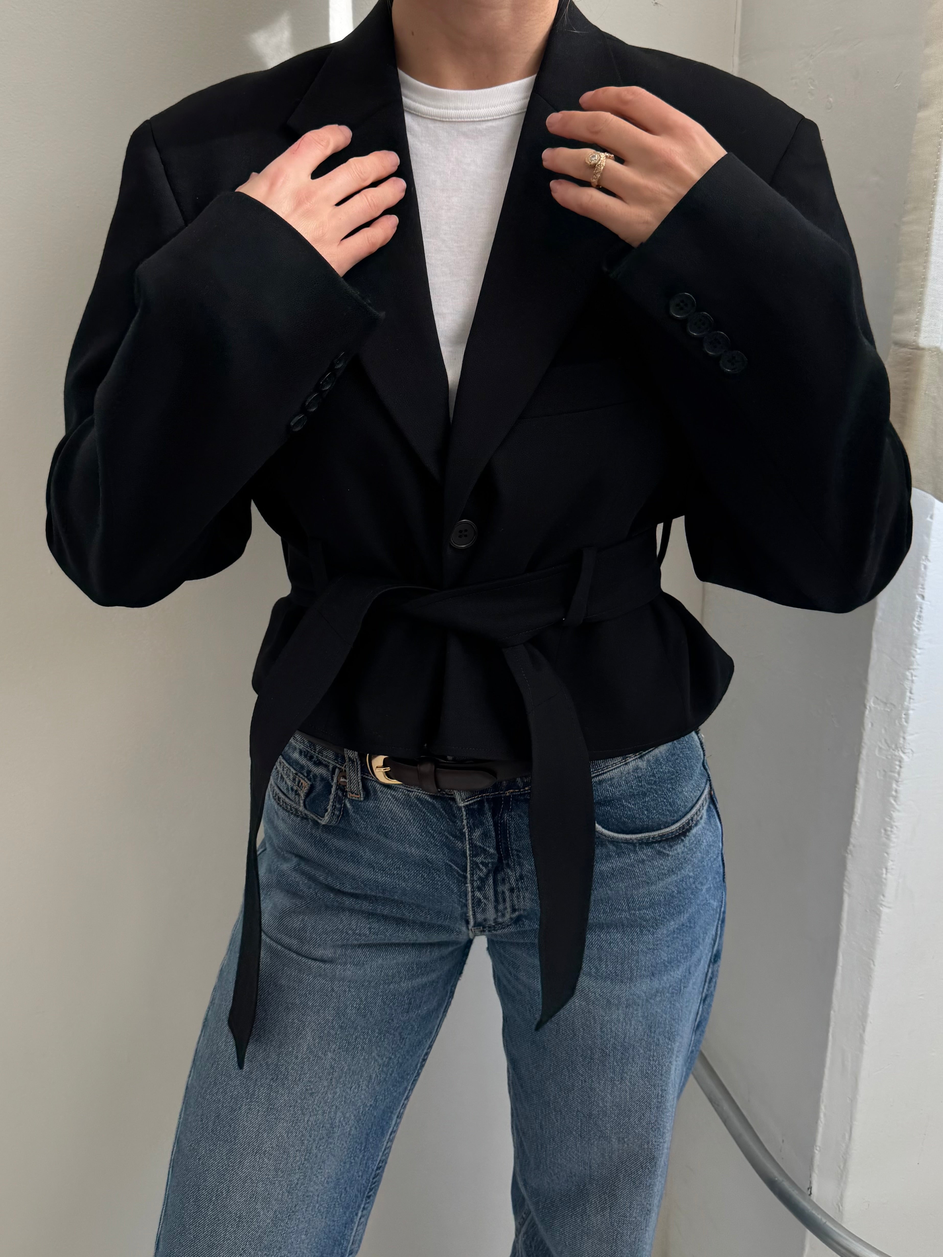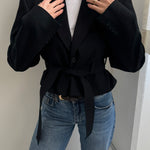 A contemporary twist to a belted jacket. Oversized shoulders, and a waist that can be worn cinched or relaxed. The collar can be buttoned up and worn