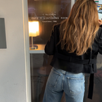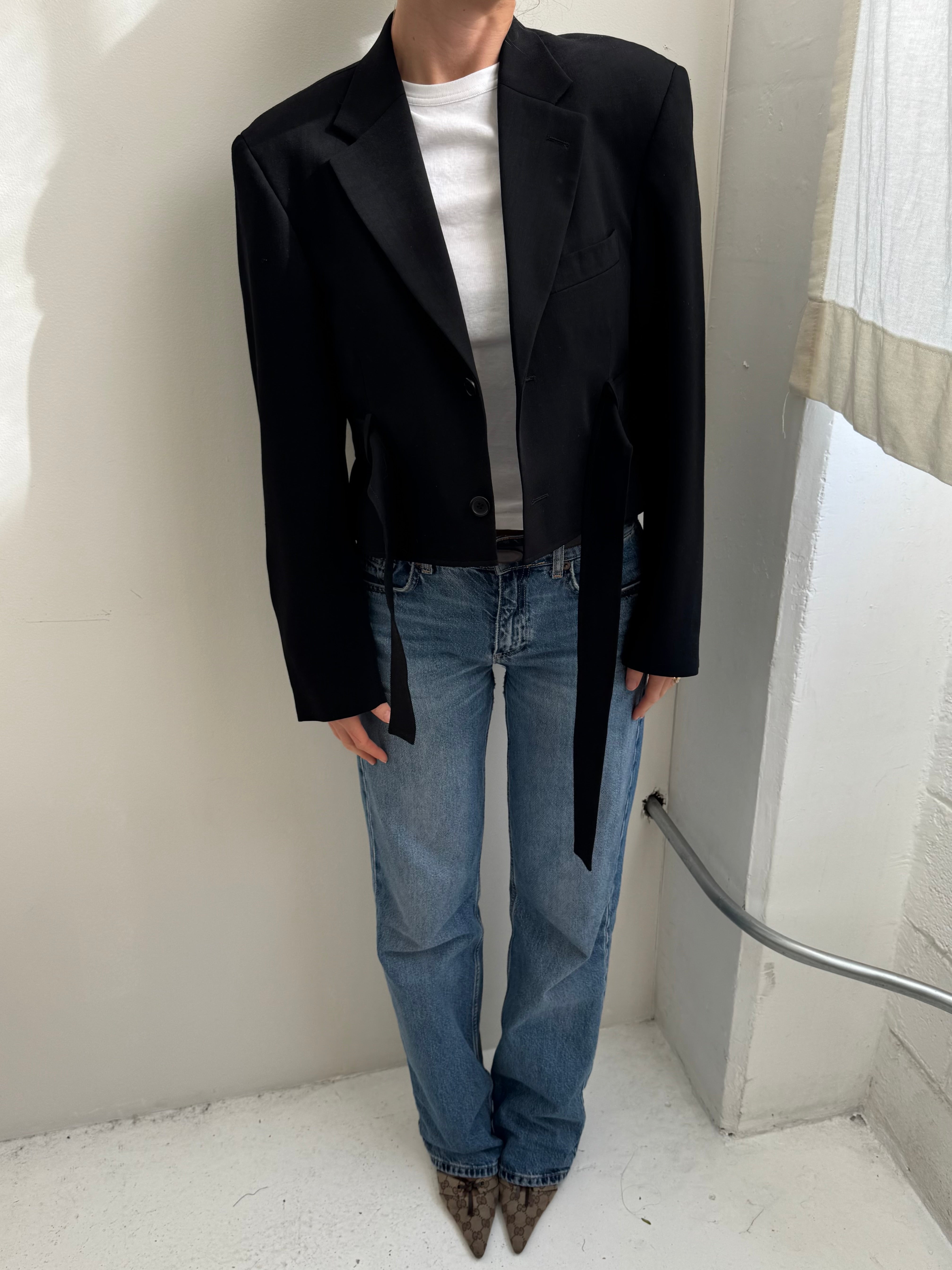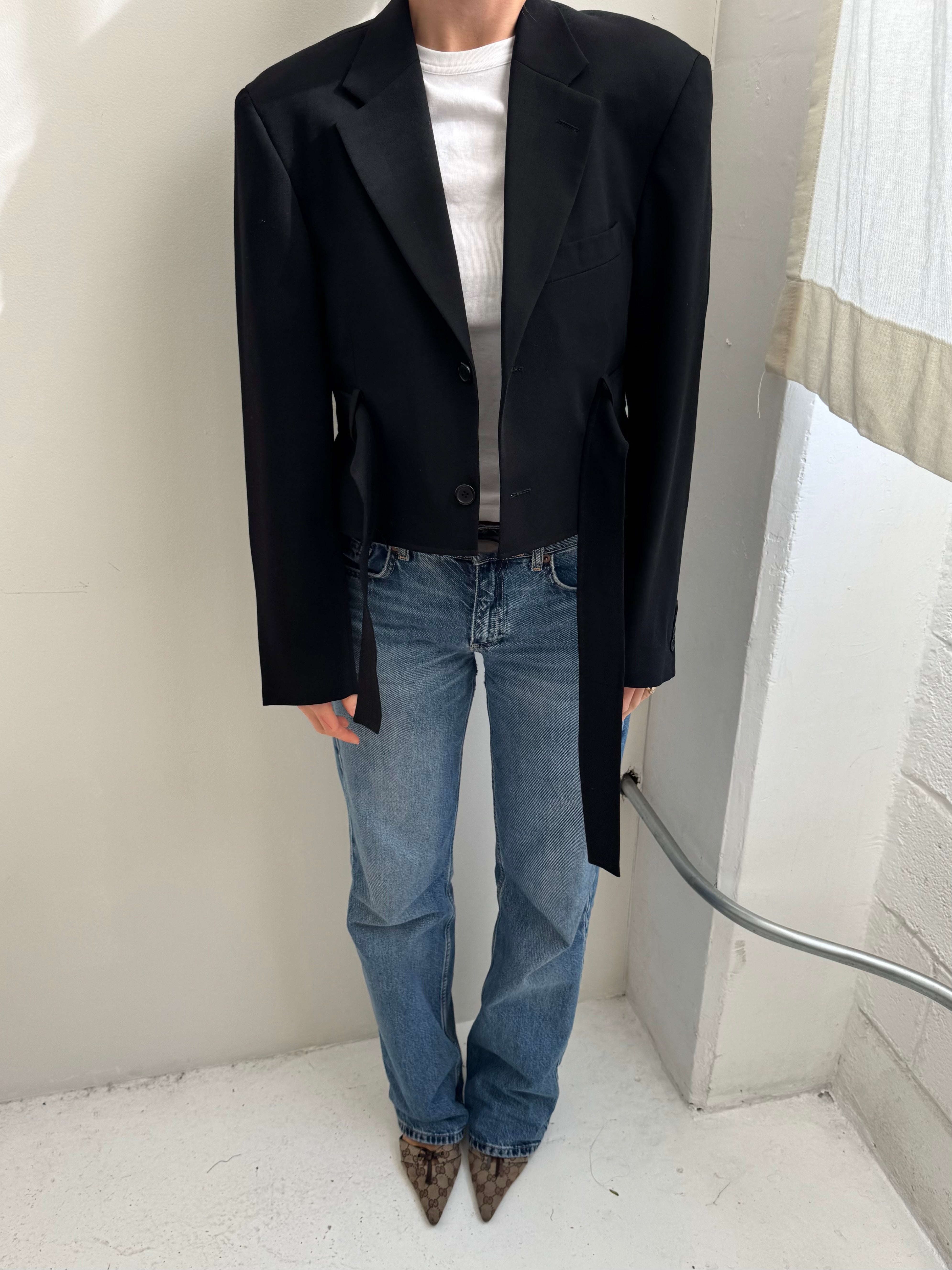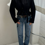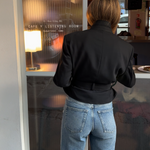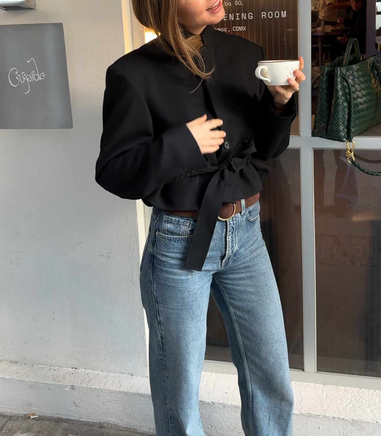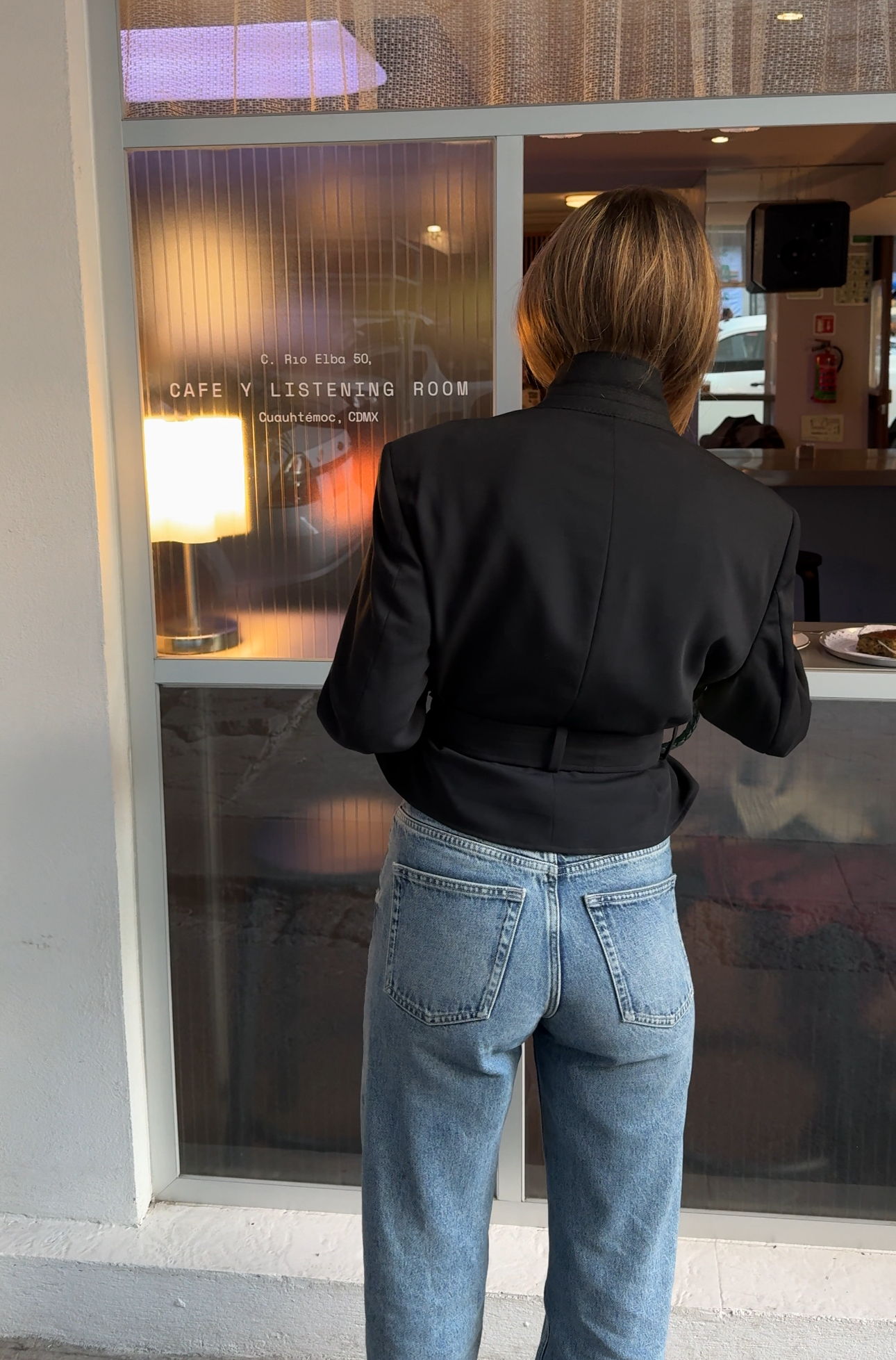 A contemporary twist to a belted jacket. Oversized shoulders, and a waist that can be worn cinched or relaxed. The collar can be buttoned up and worn