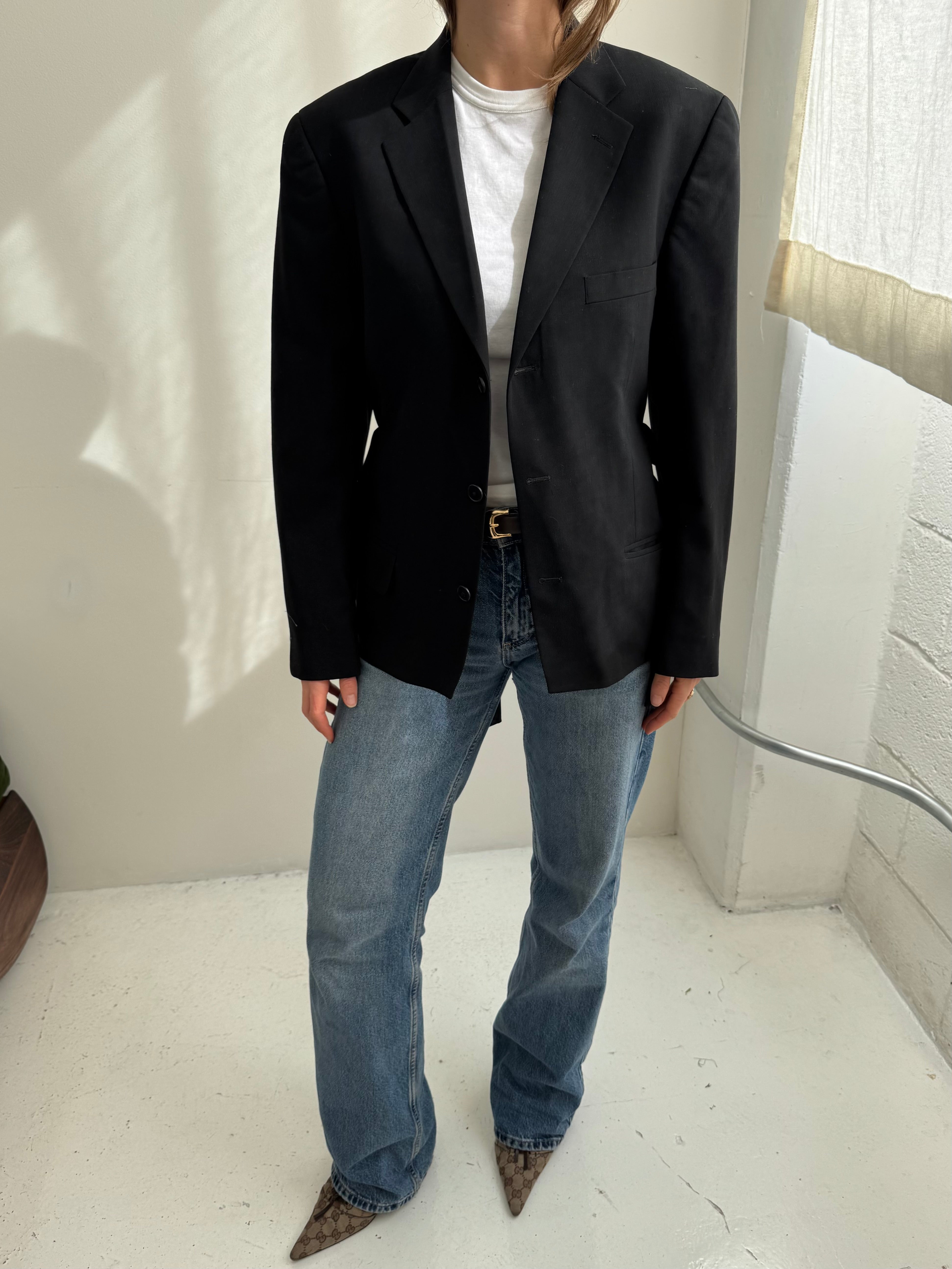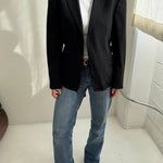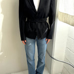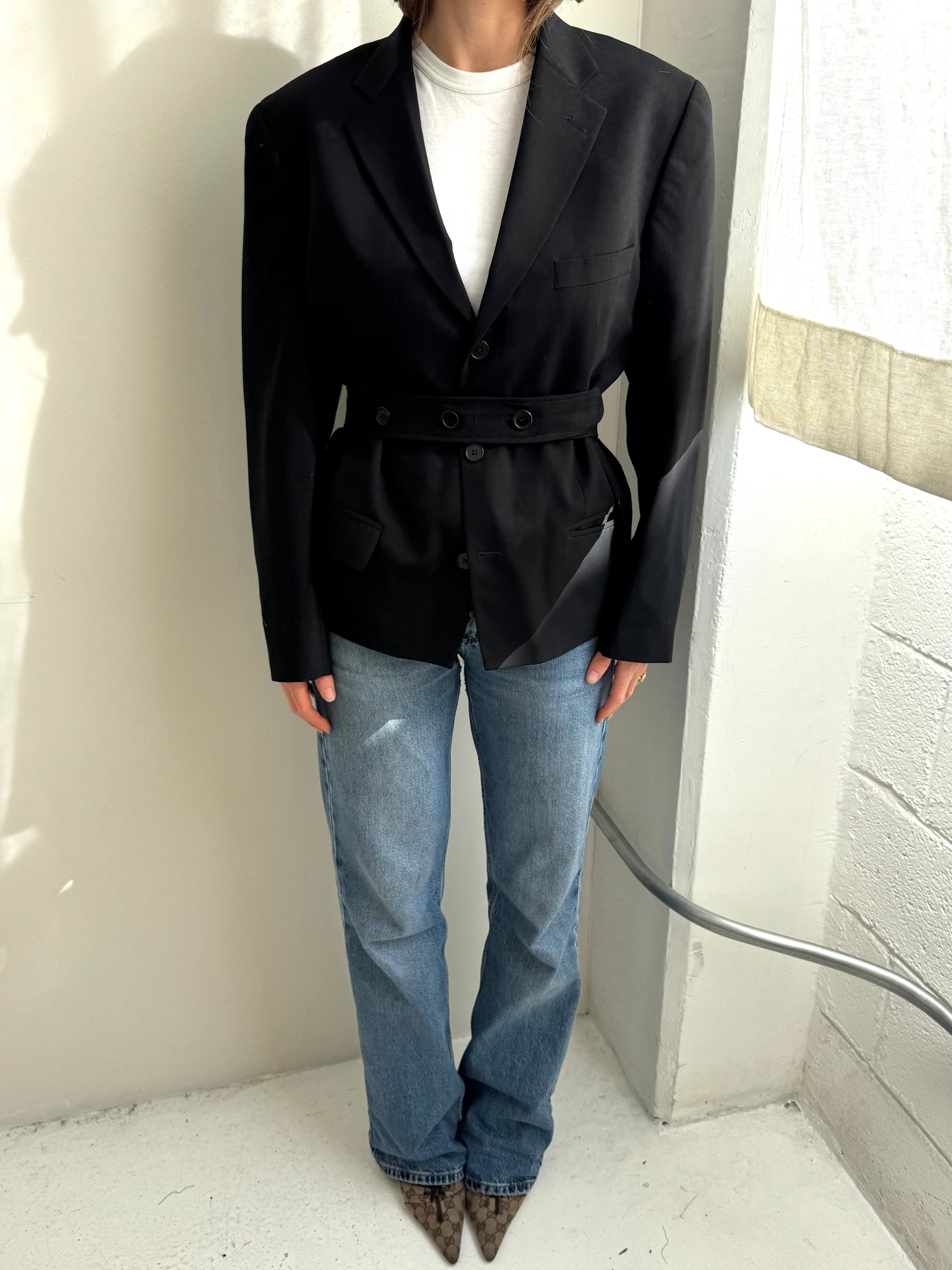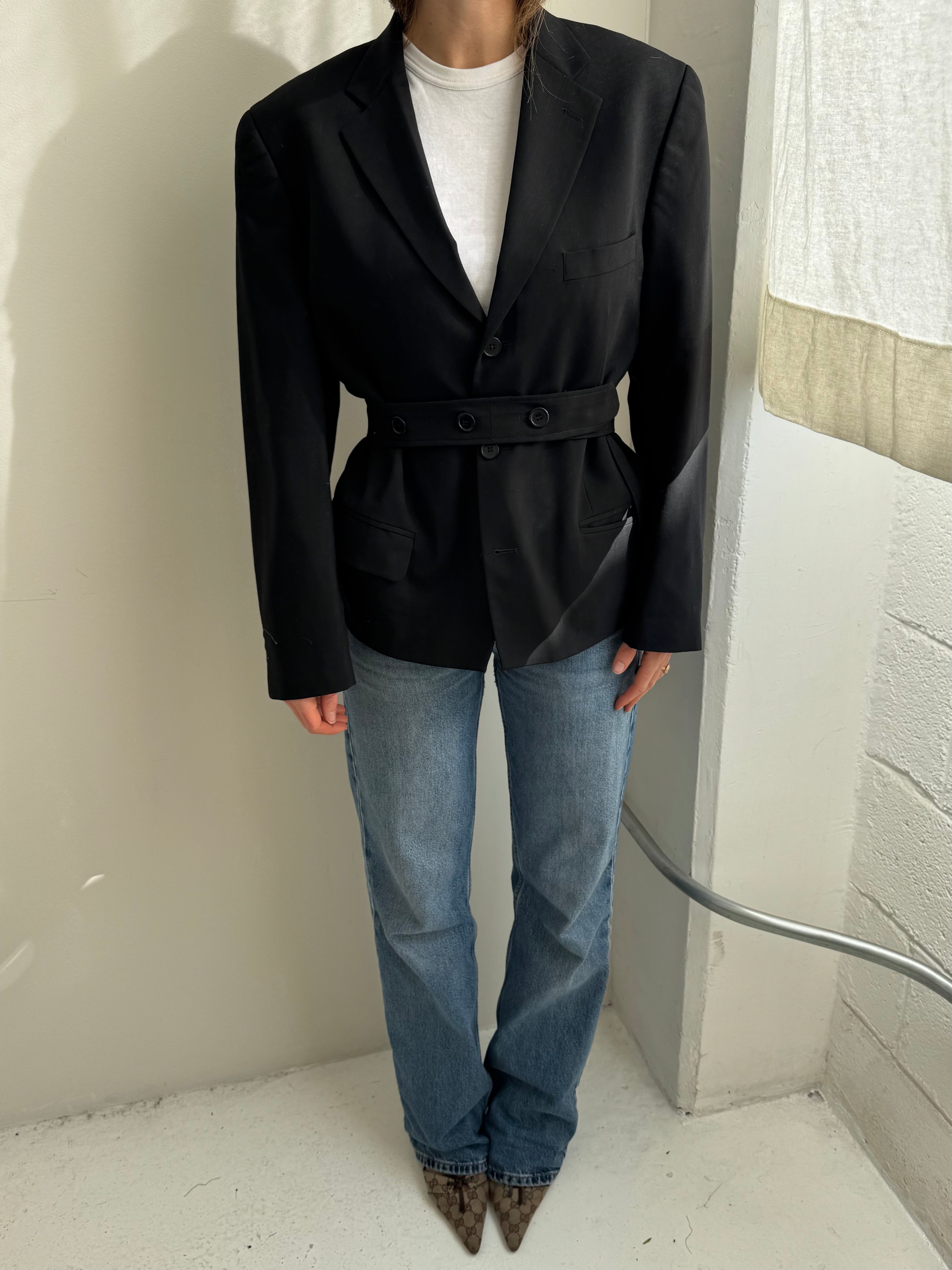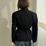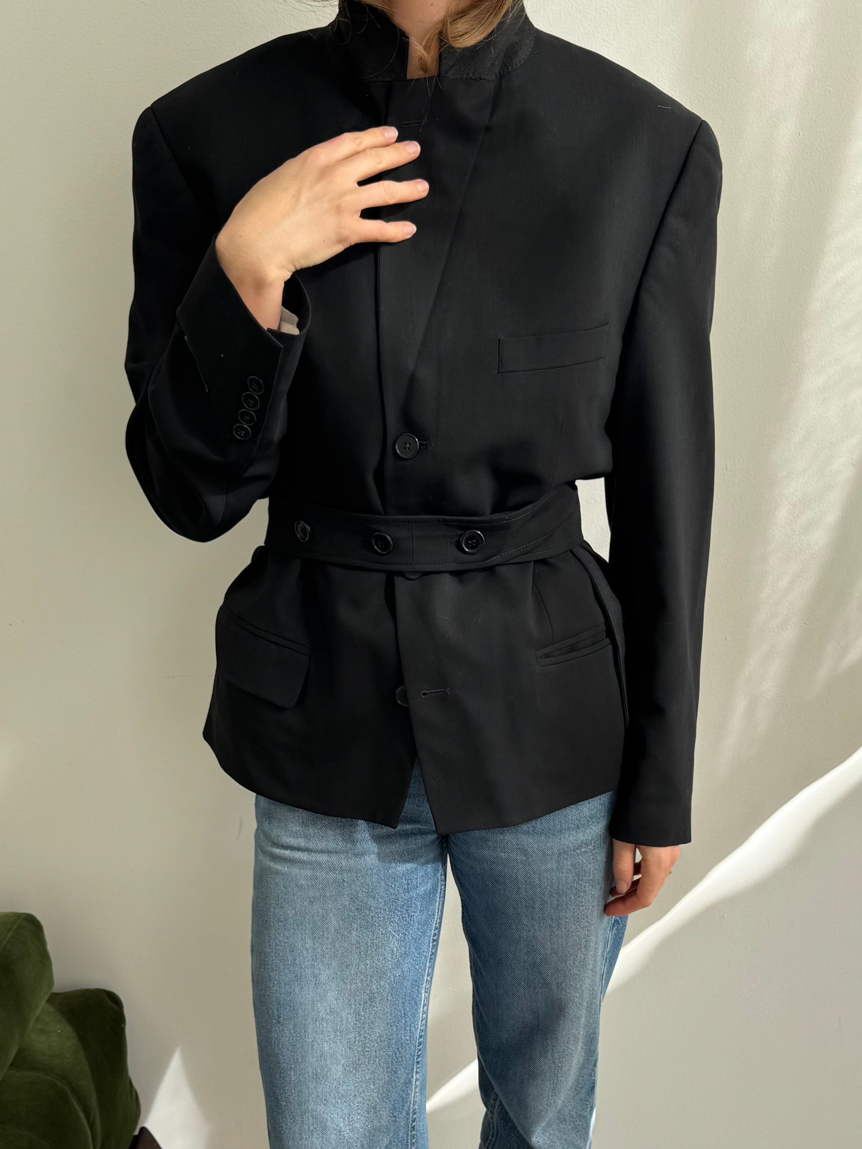 A contemporary twist to a belted jacket. Oversized shoulders, and a waist that can be worn cinched or relaxed. The collar can be buttoned up and worn