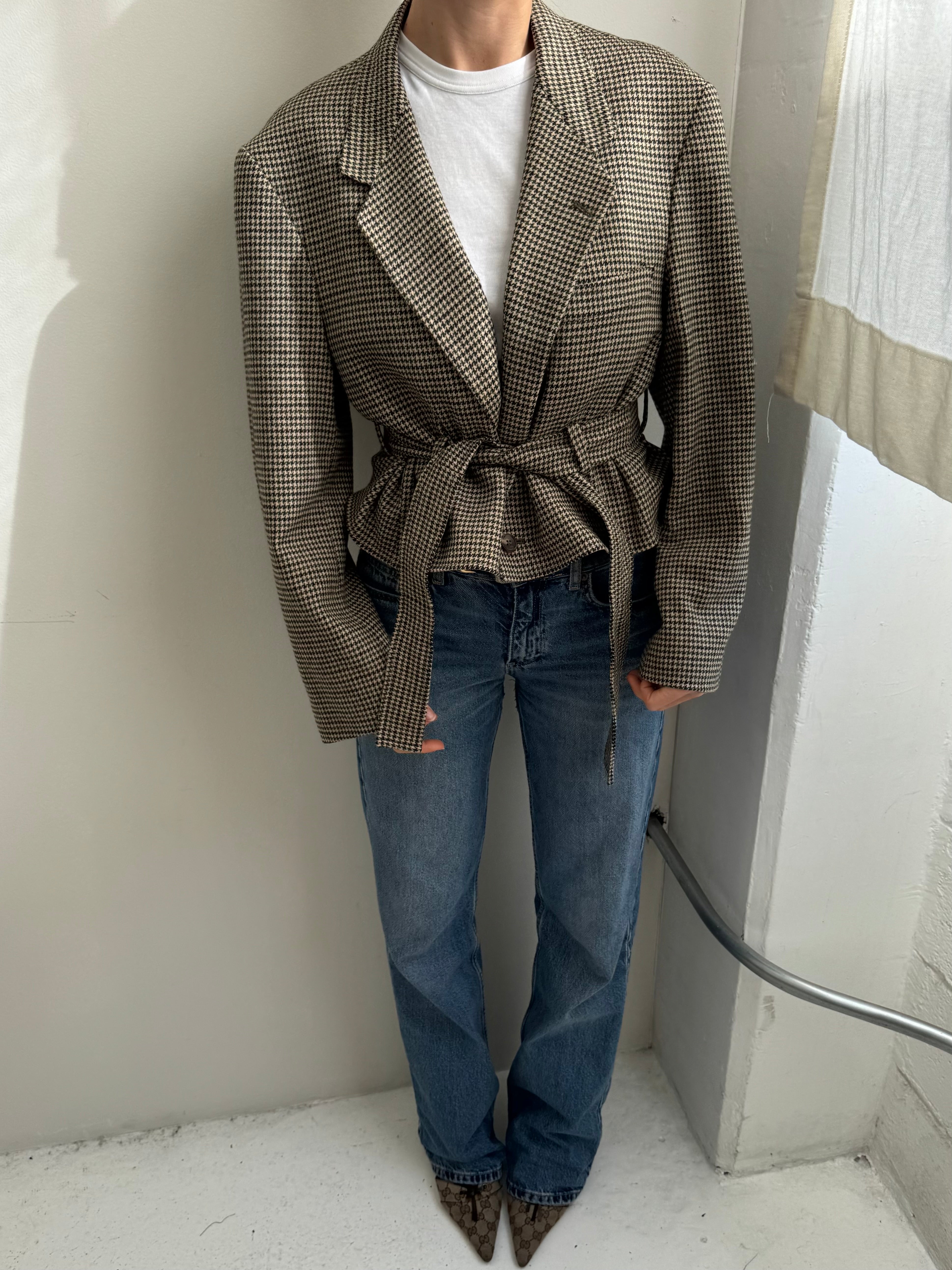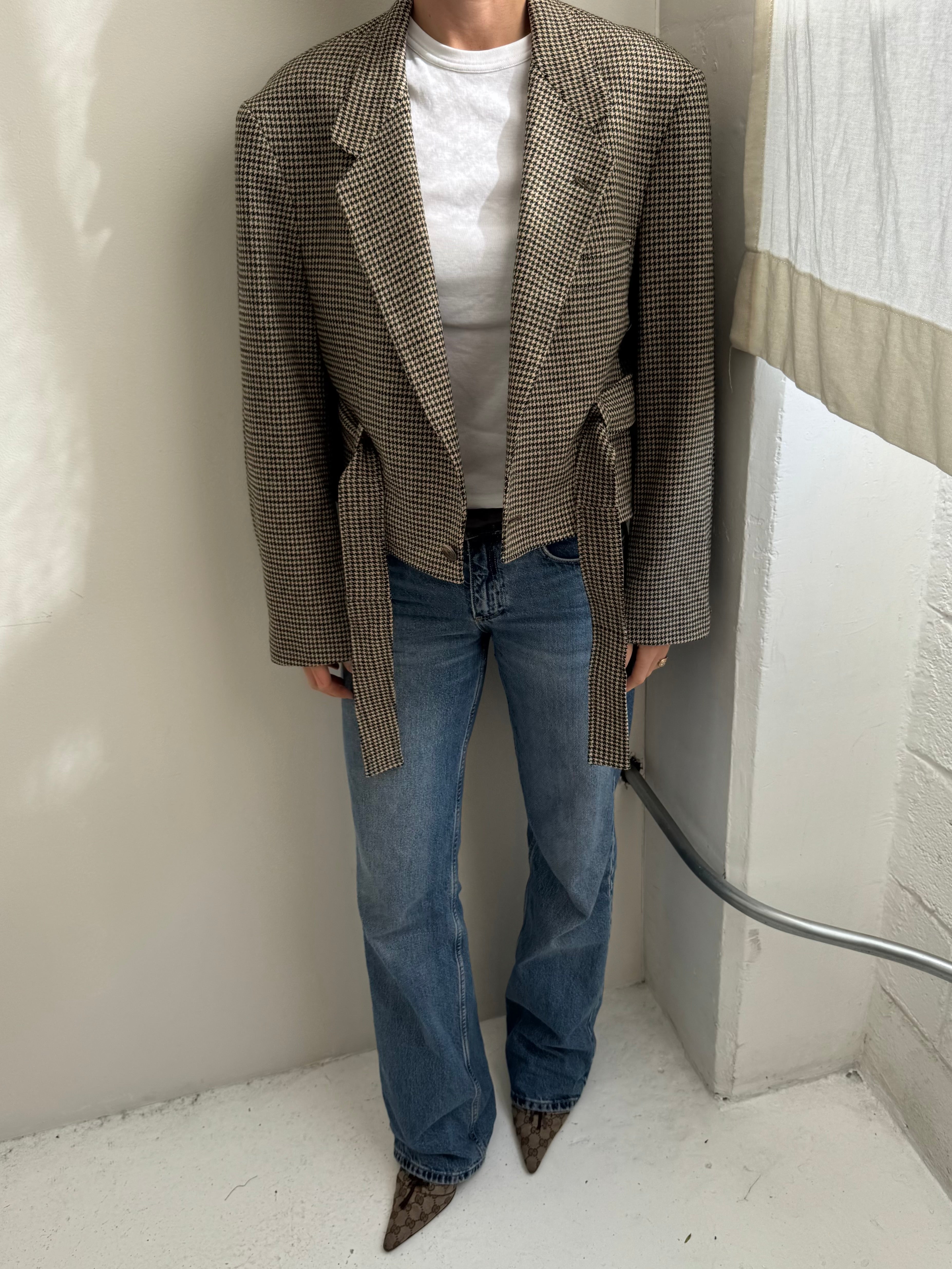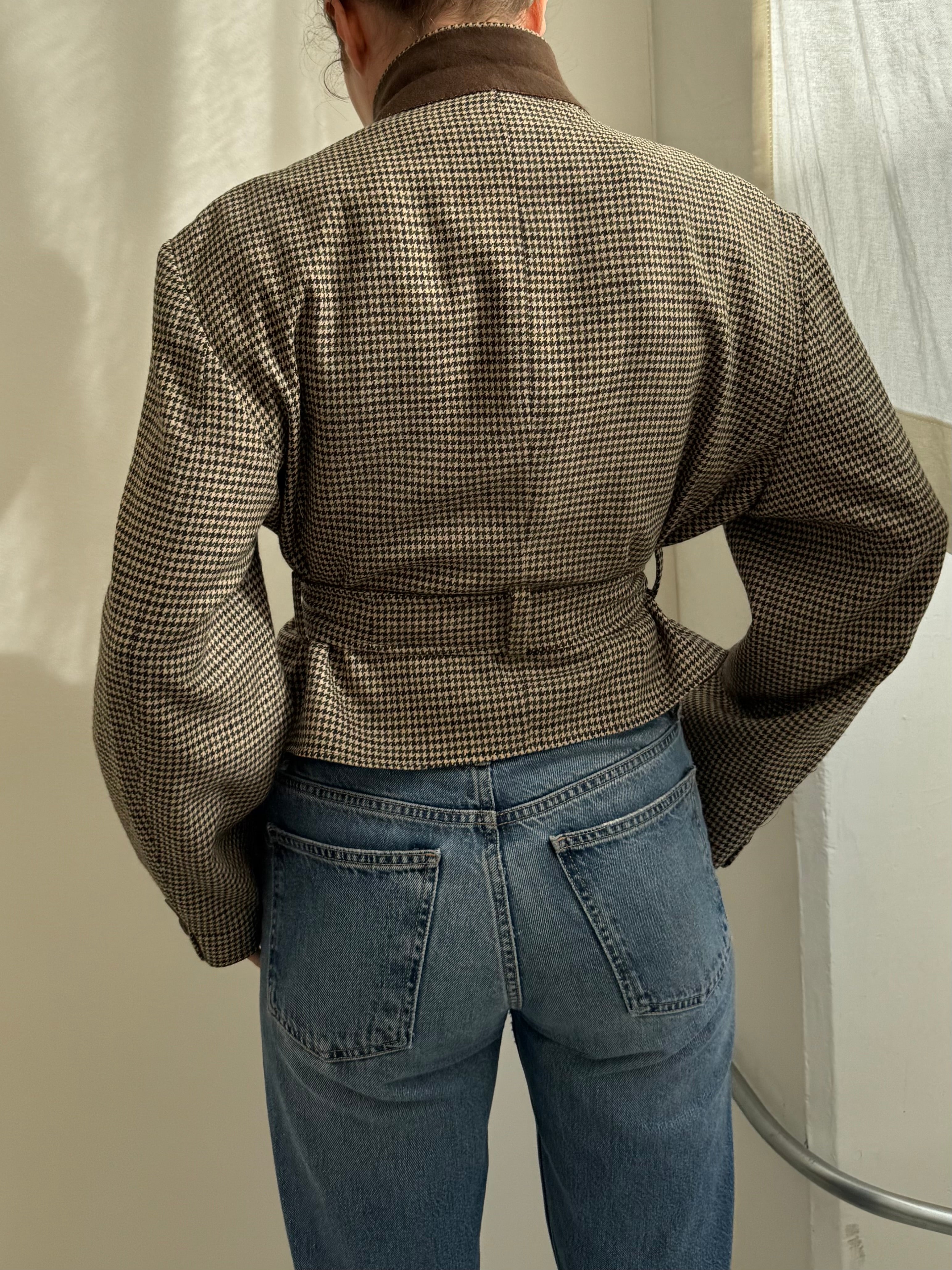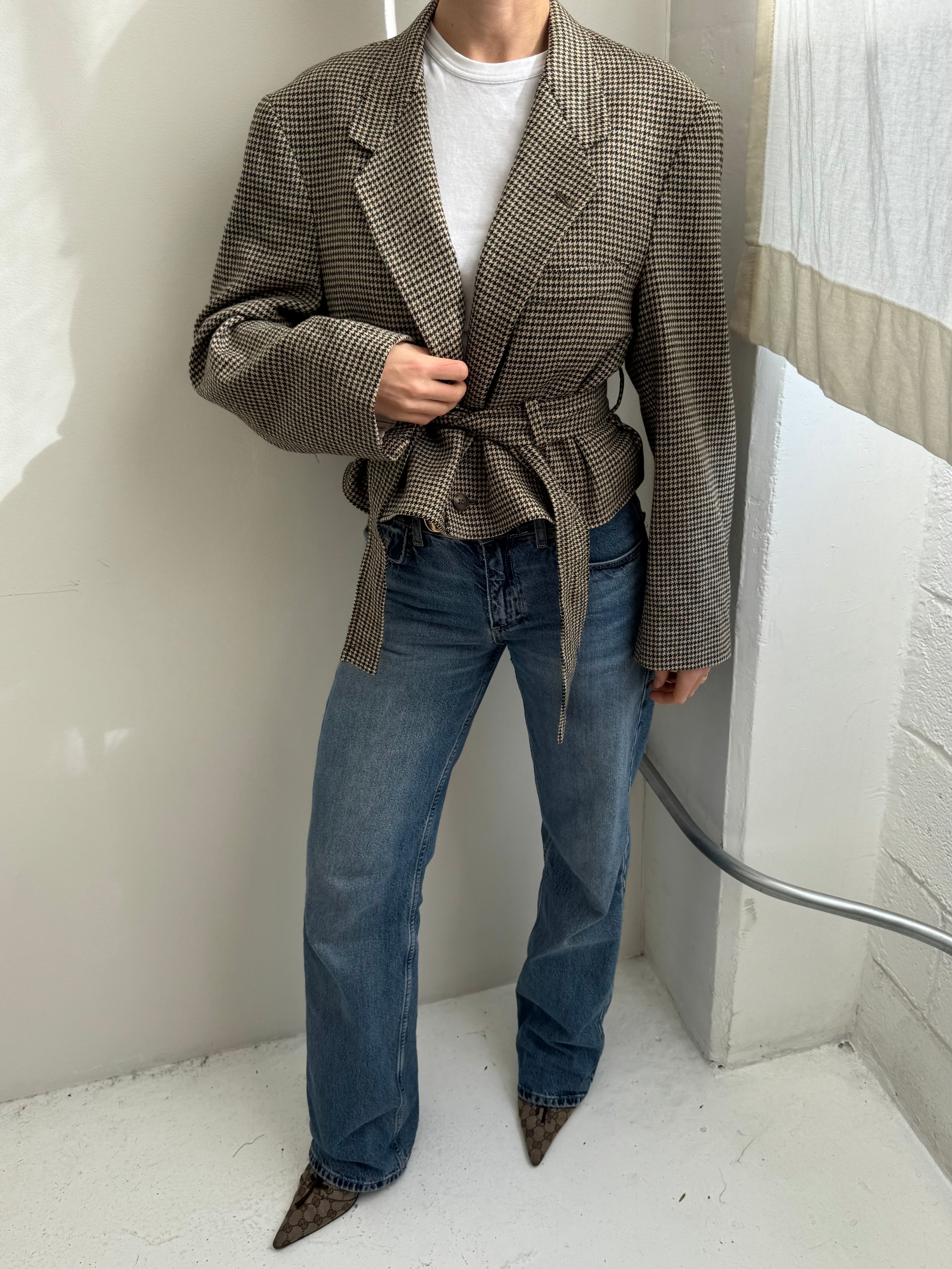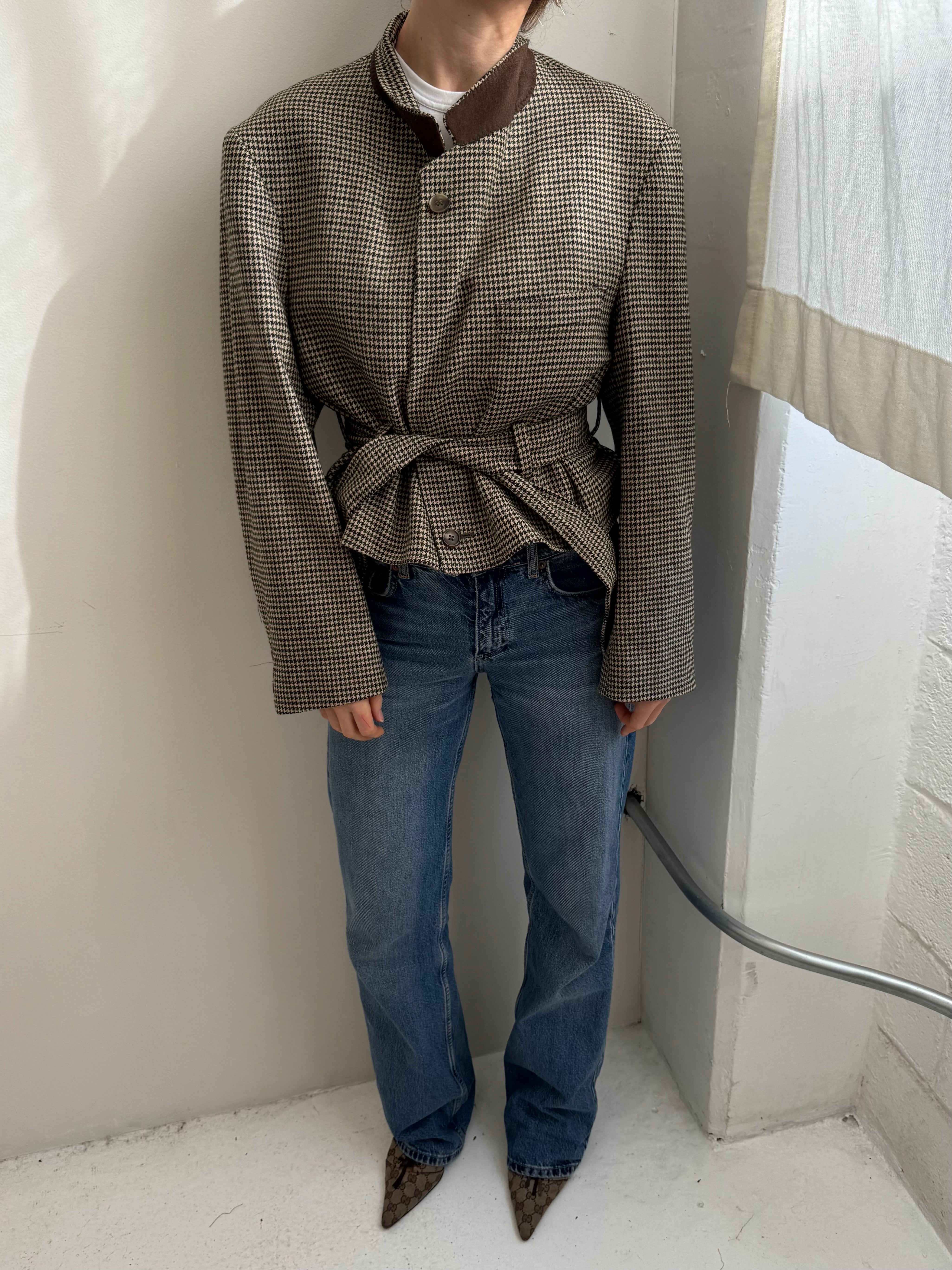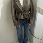 A contemporary twist to a belted jacket. Oversized shoulders, and a waist that can be worn cinched or relaxed. The collar can be buttoned up and worn
