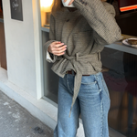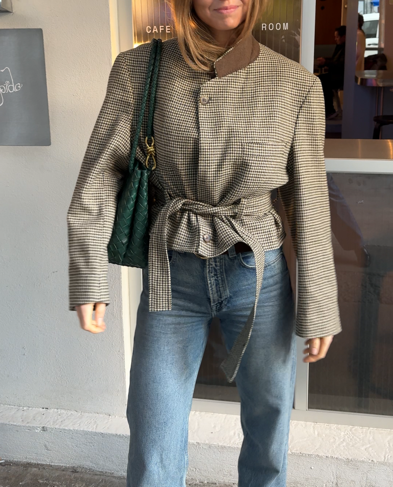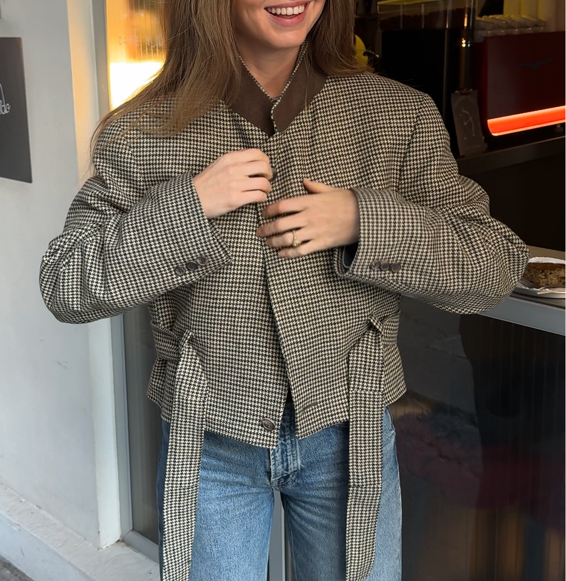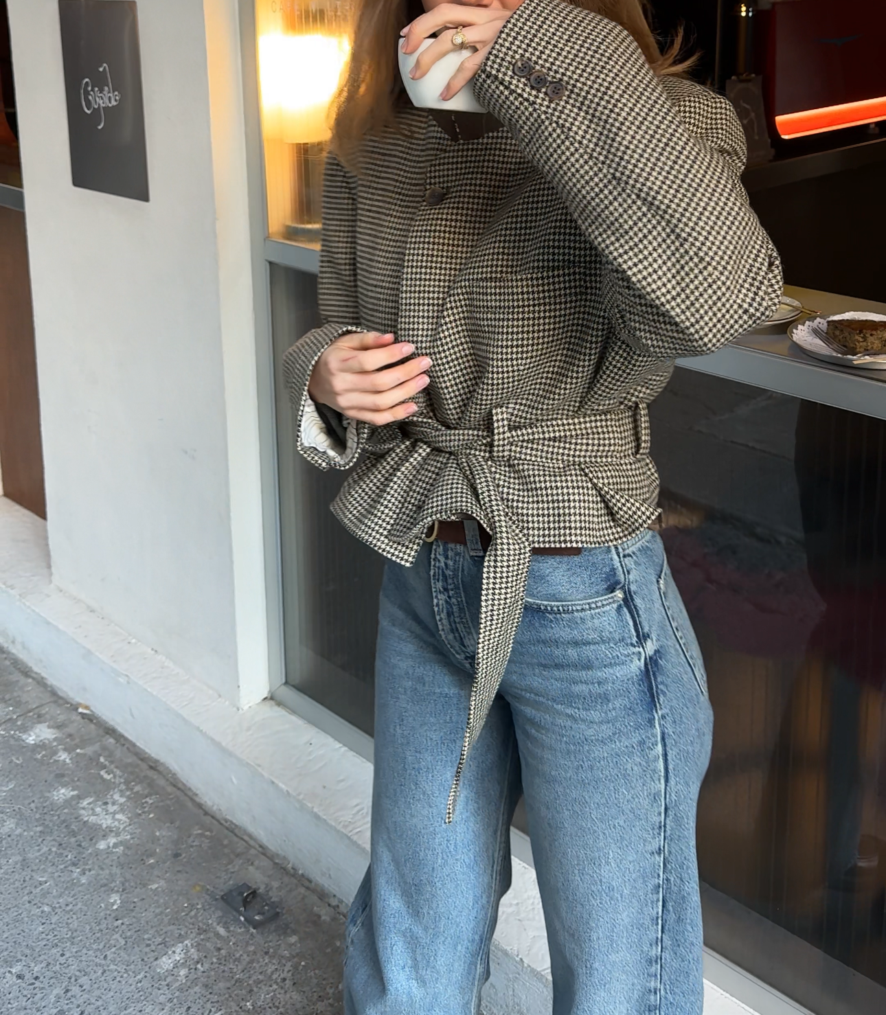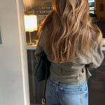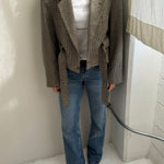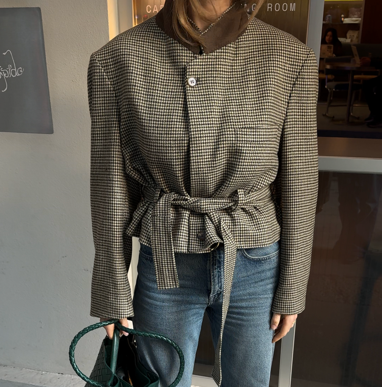 A contemporary twist to a belted jacket. Oversized shoulders, and a waist that can be worn cinched or relaxed. The collar can be buttoned up and worn