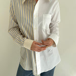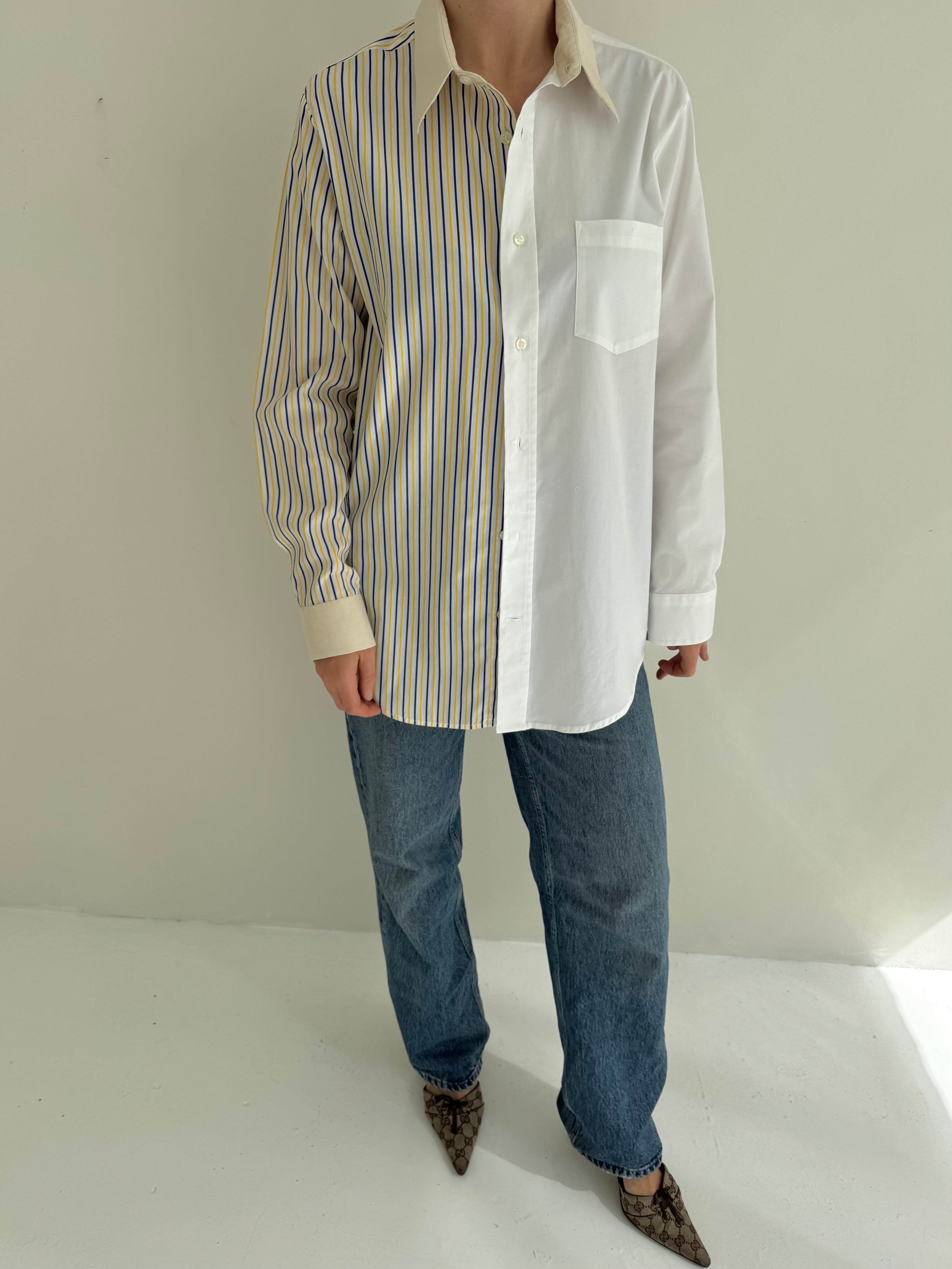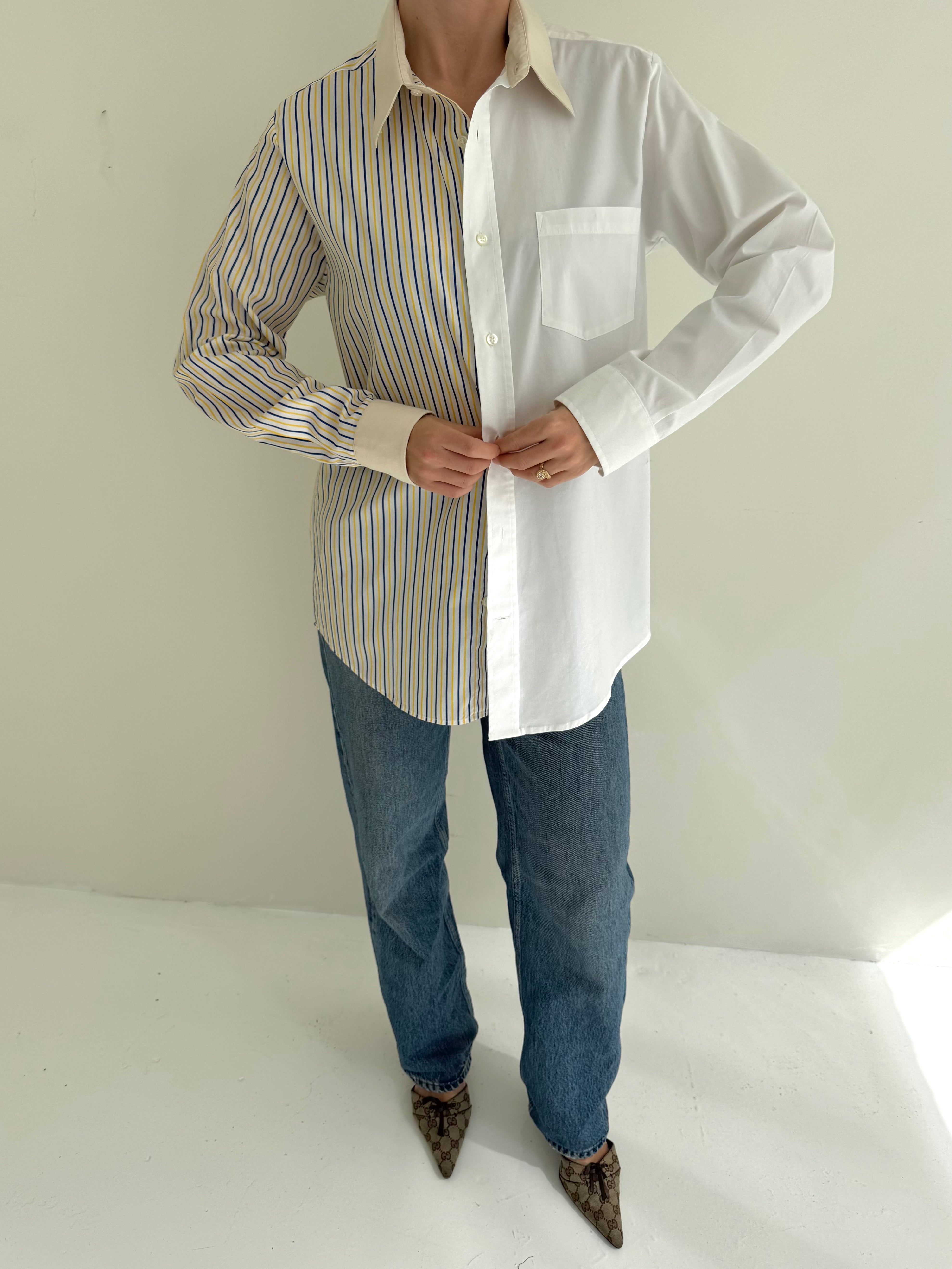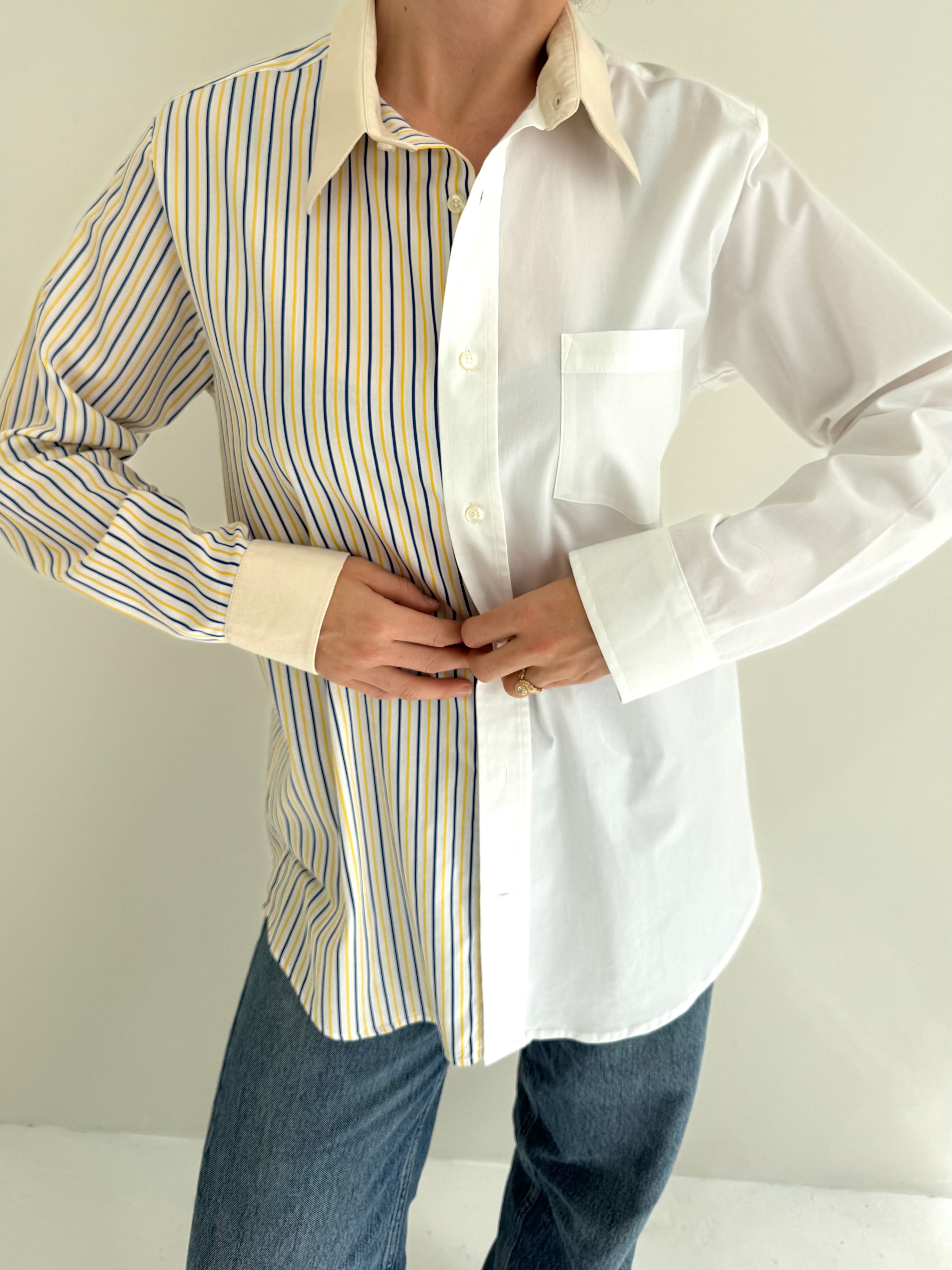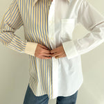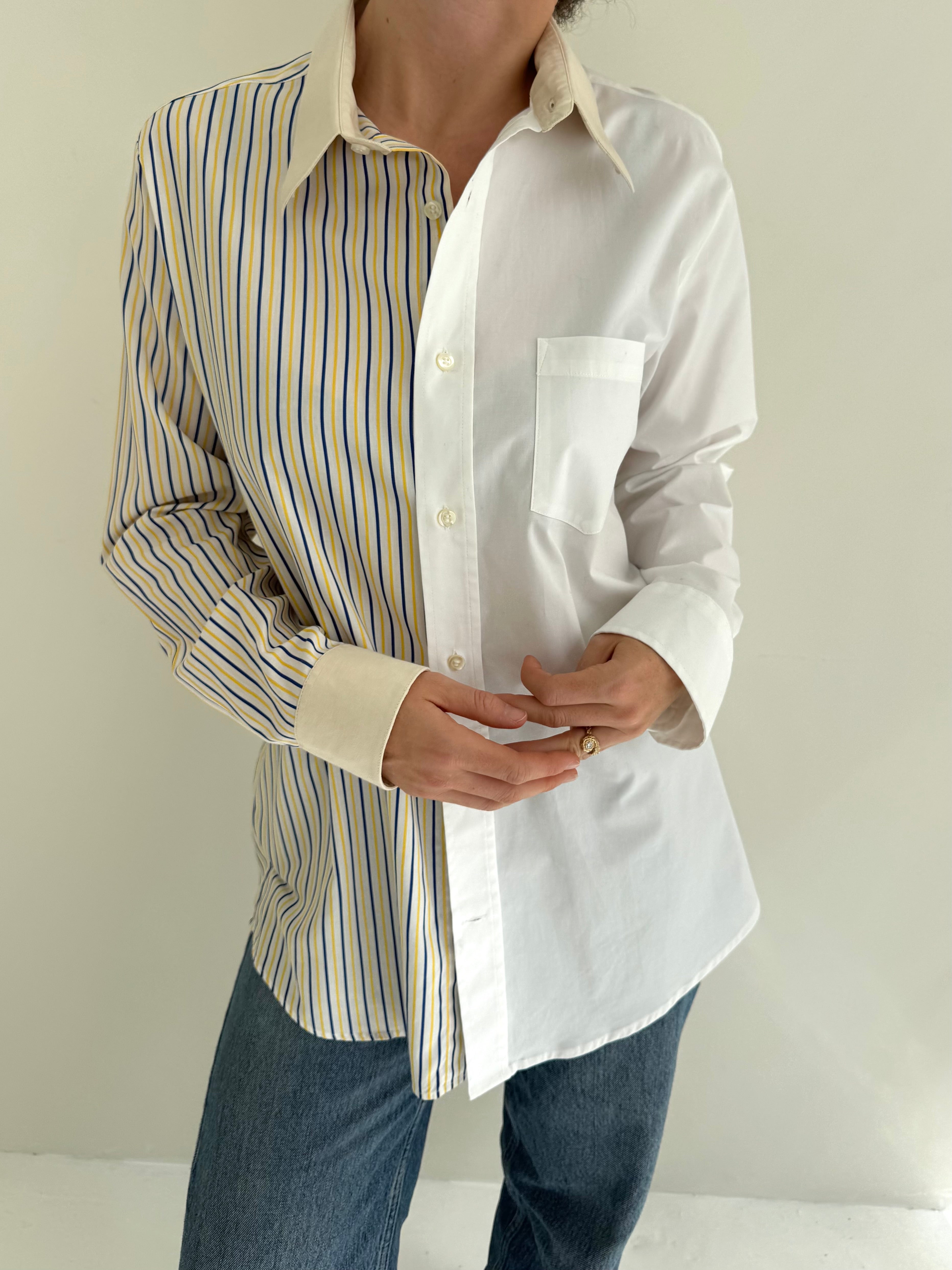 Vintage reworked mens shirt, turned into a flattering and airy silhouette with ties on the back. This piece is zero waste and is up cycled into a feminine silhouetted blouse. Carefully curated, professionally tailored and professionally dry-cleaned. Machine wash at 30 degrees celsius.