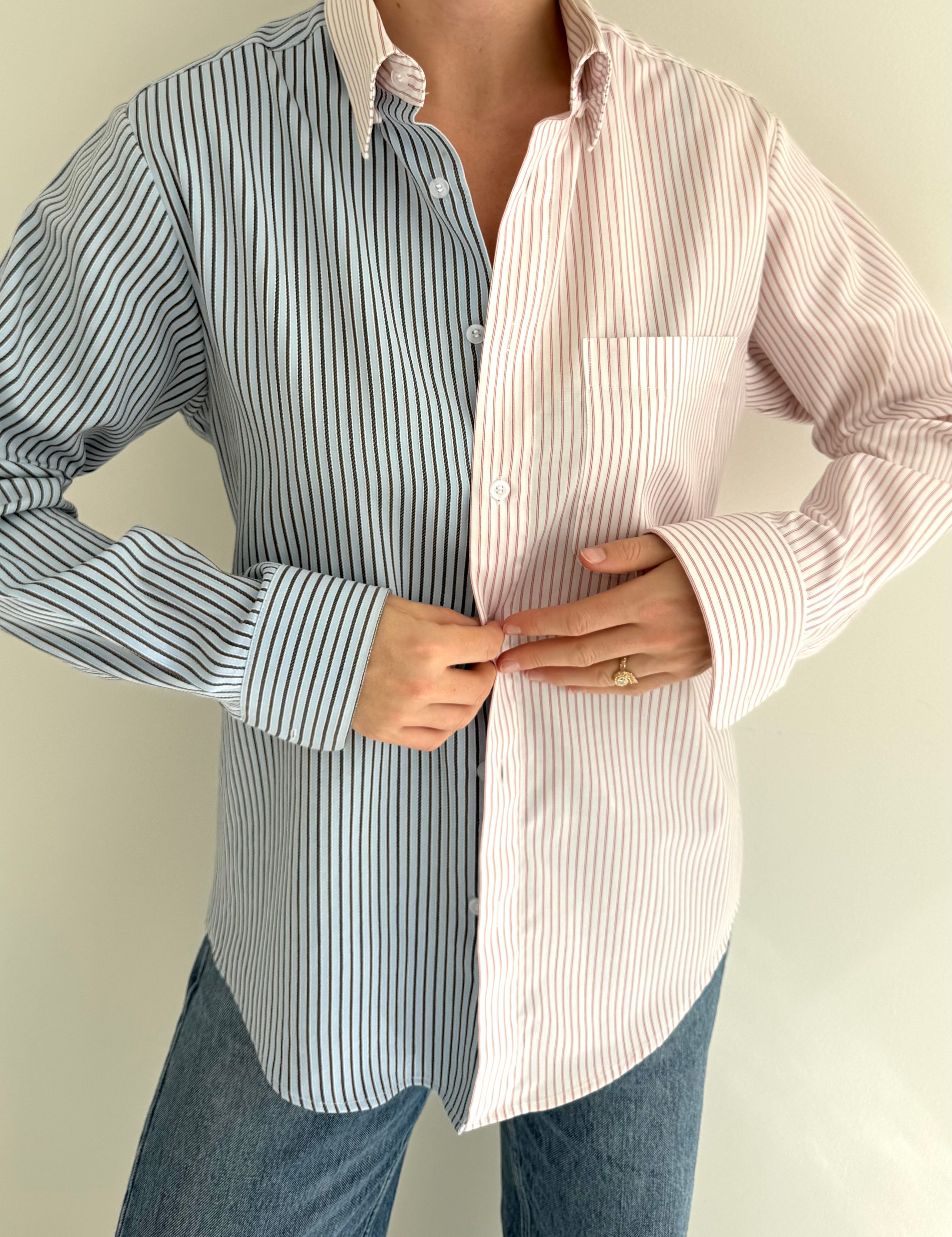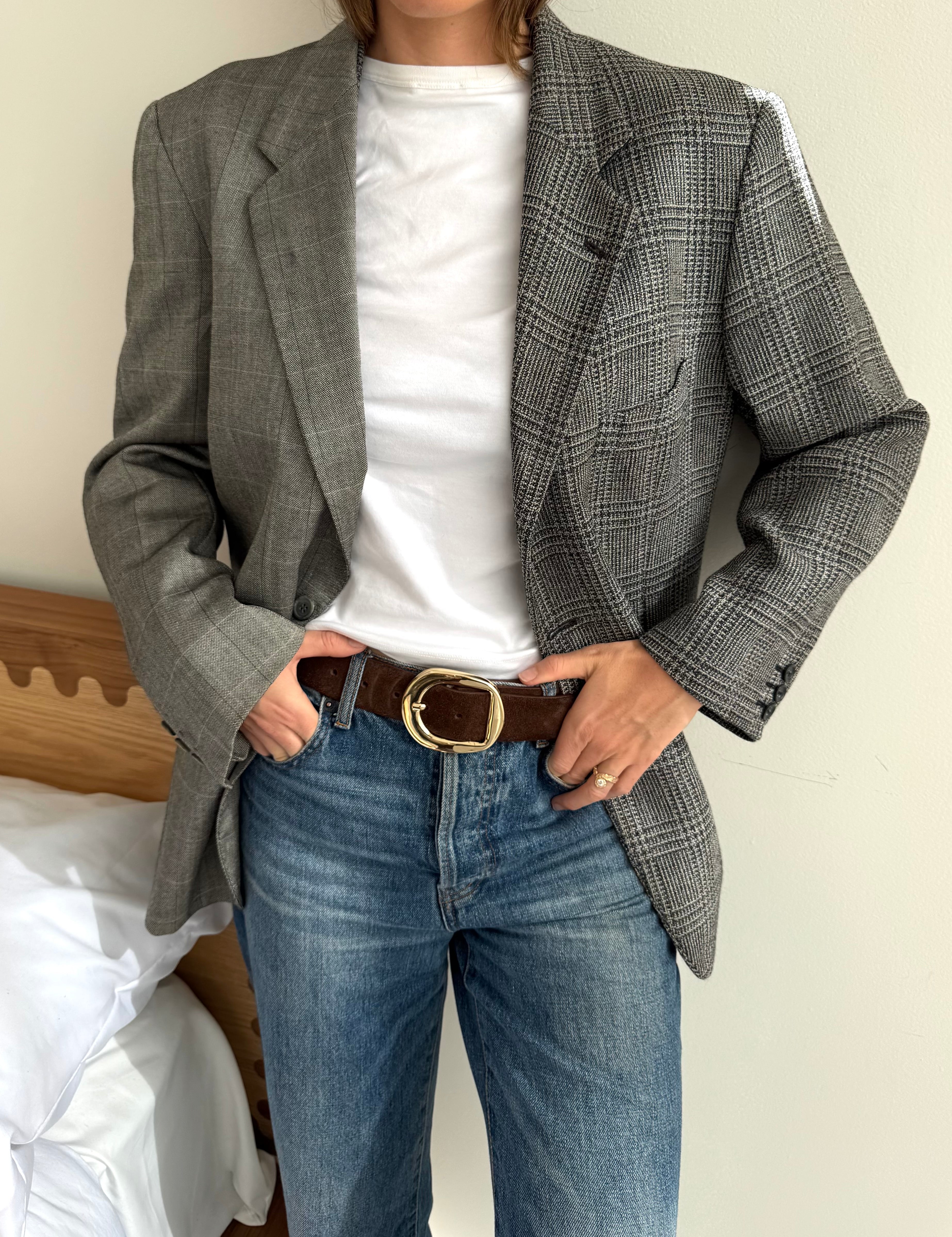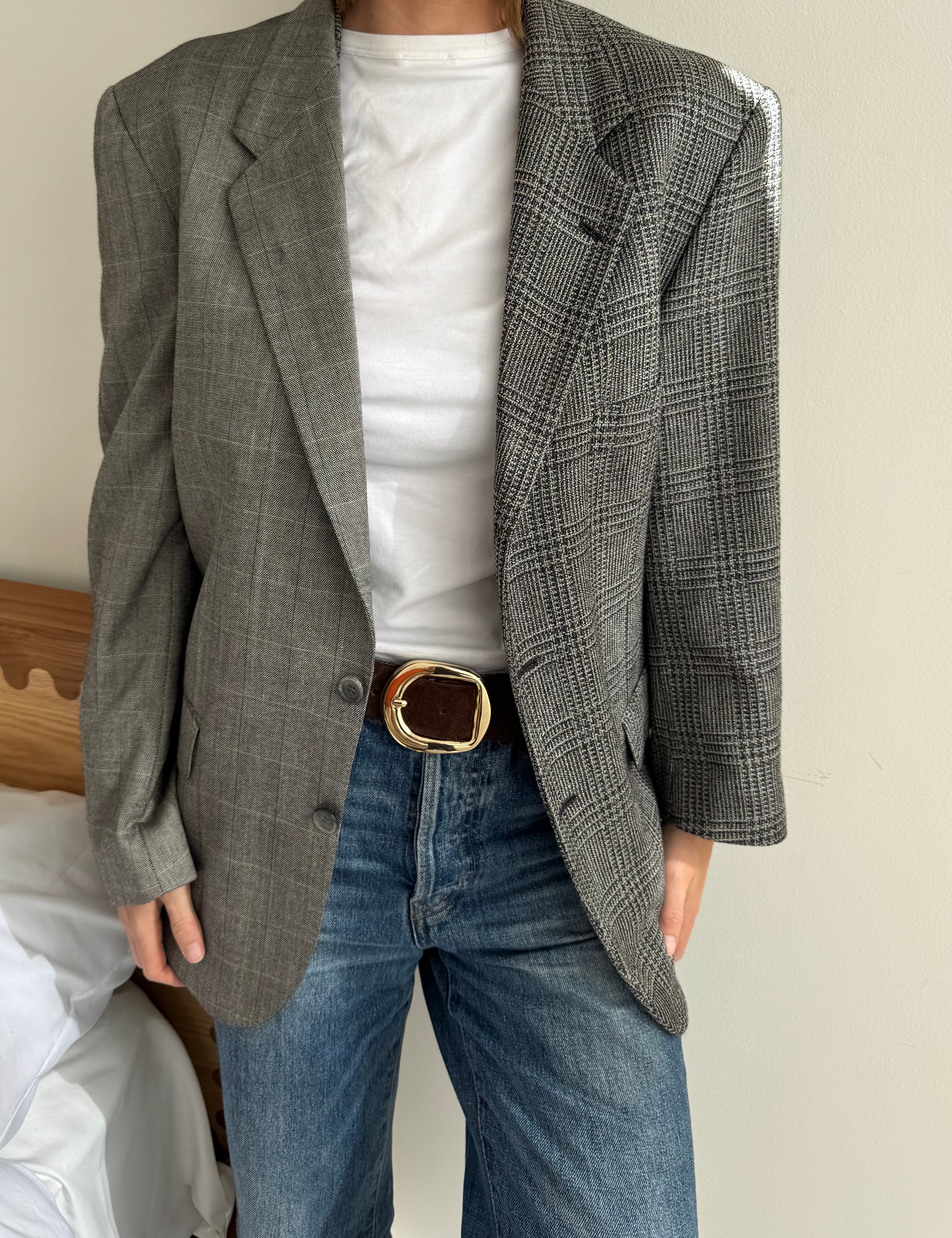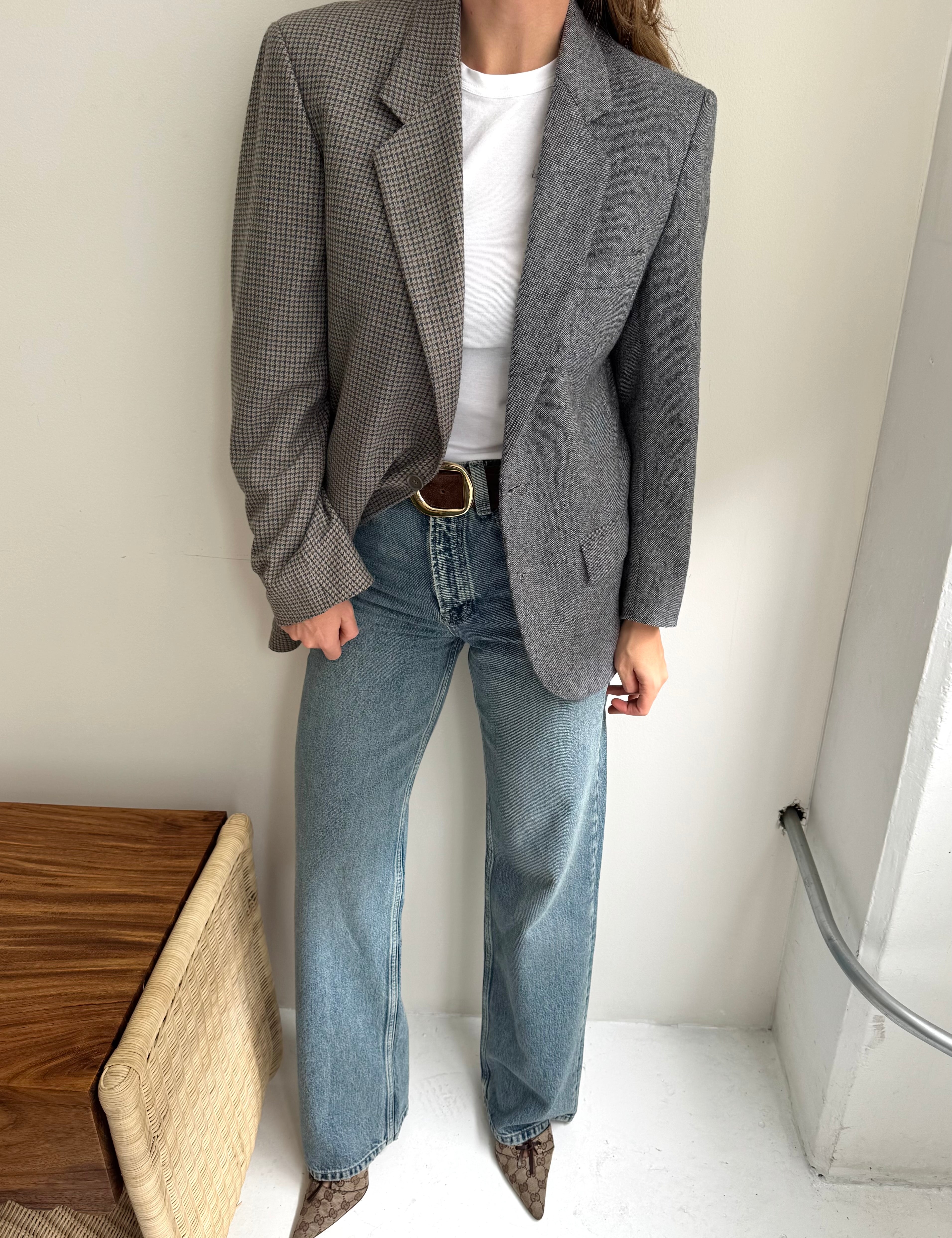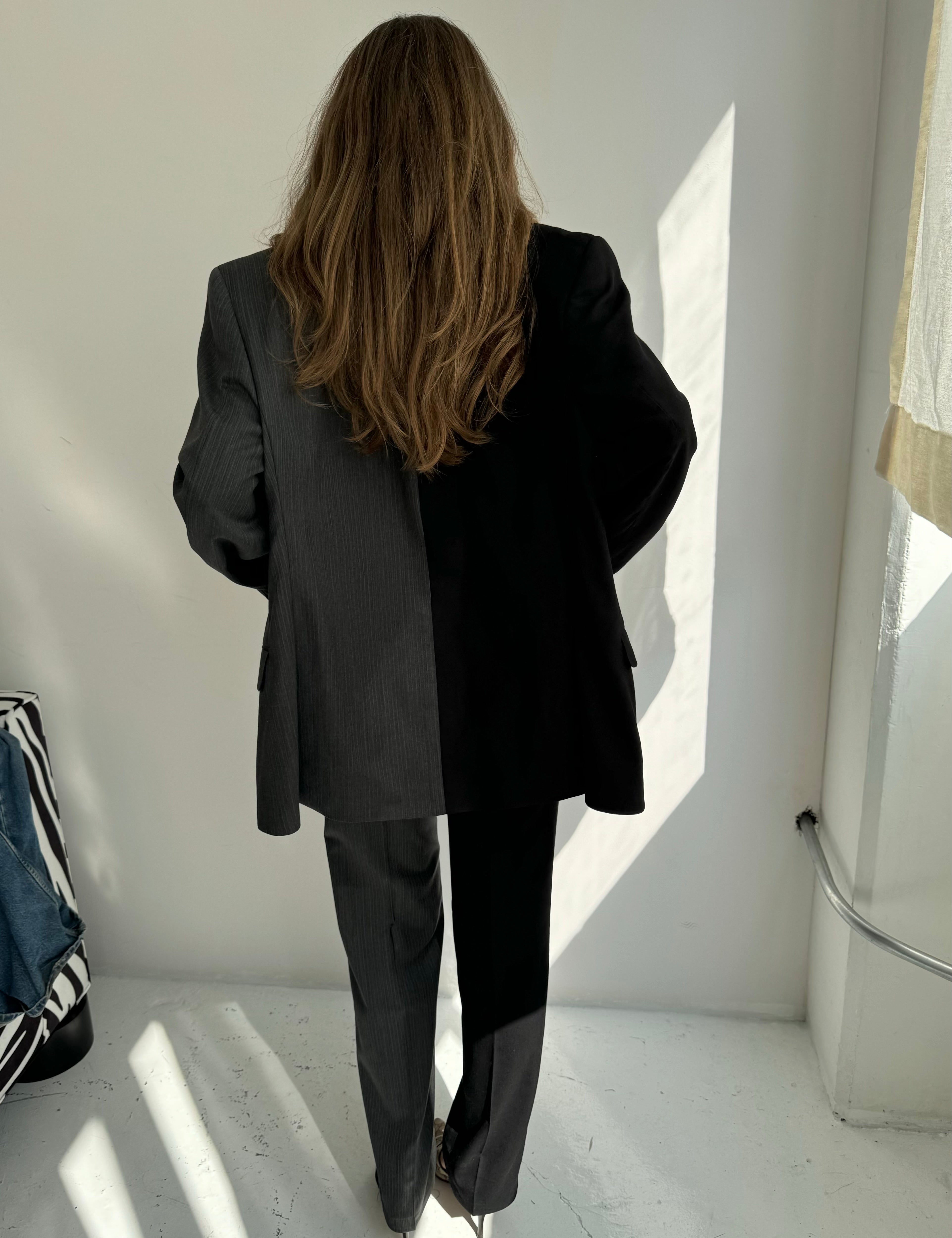 A match made in heaven. Two carefully sourced vintage blazers, made into one, adding a twist to the classic and timeless oversized blazer. Perfect for all occasions and always super versatile. Wear it with jeans or on its own, daytime or evening. Carefully curated, tailored and dry cleaned. Beautiful quality, and always made from silk, cashmere, cotton or wool.The sewing has been done well, however there may be slight differences in length/shoulder, as the jacket is made from two recycled blazers.
