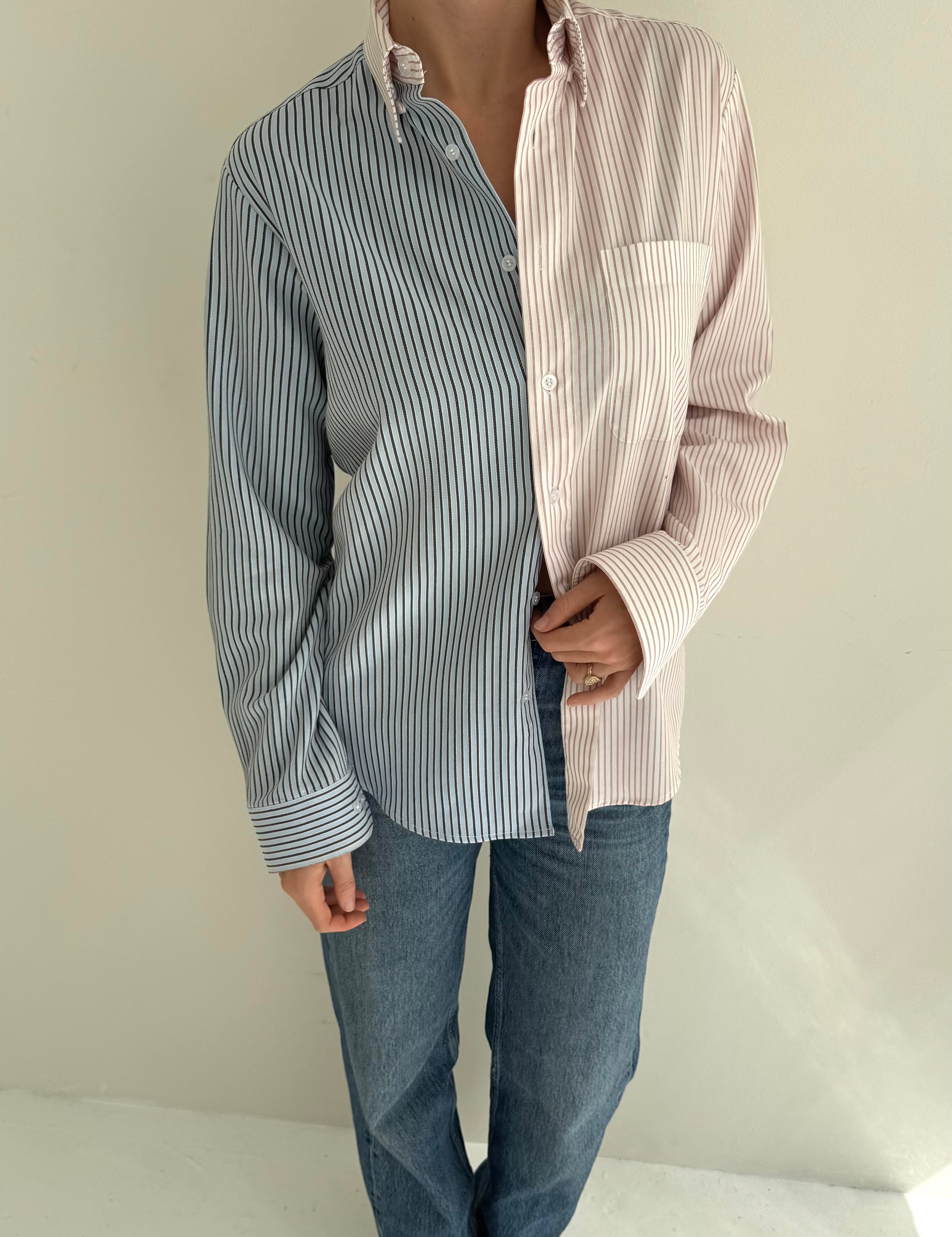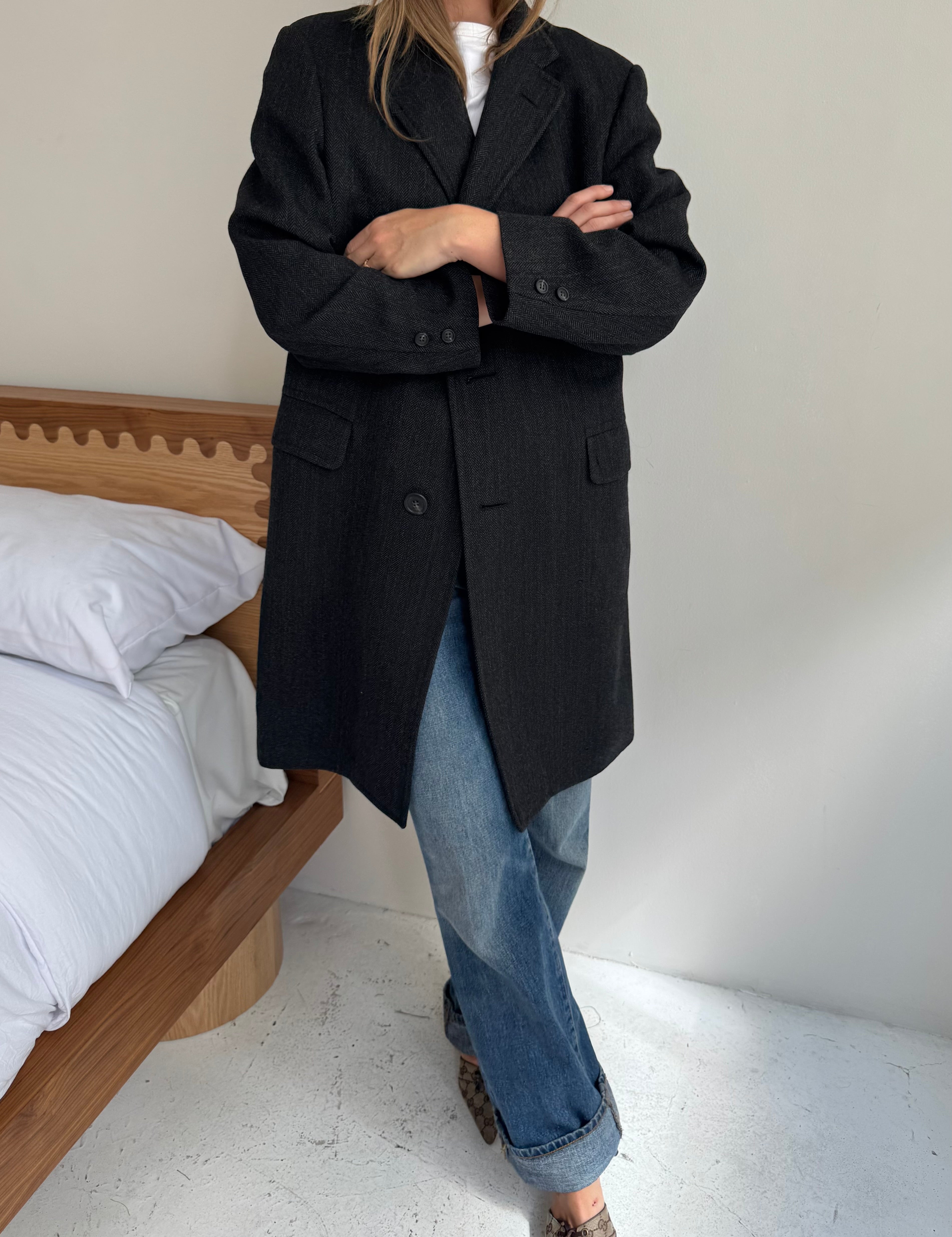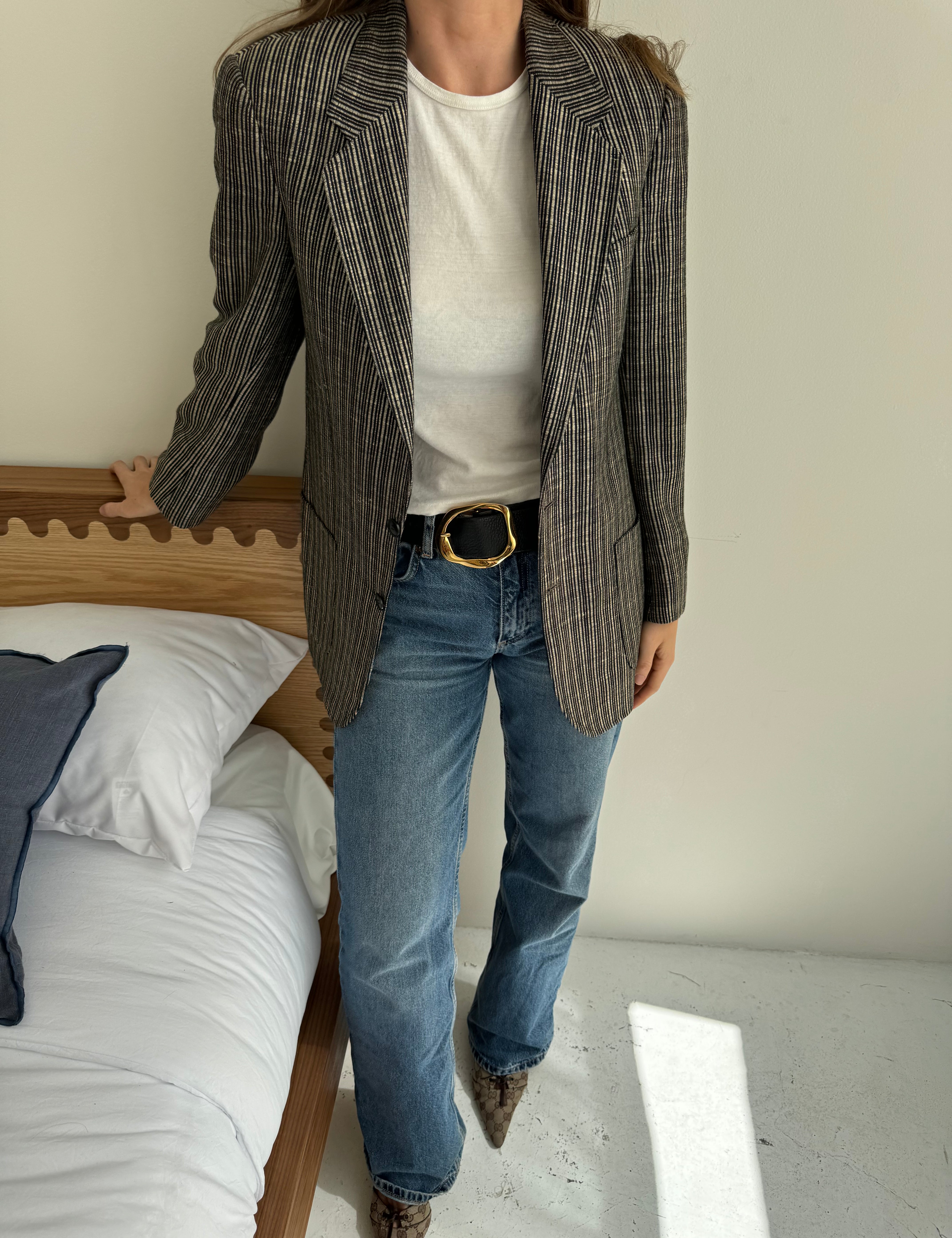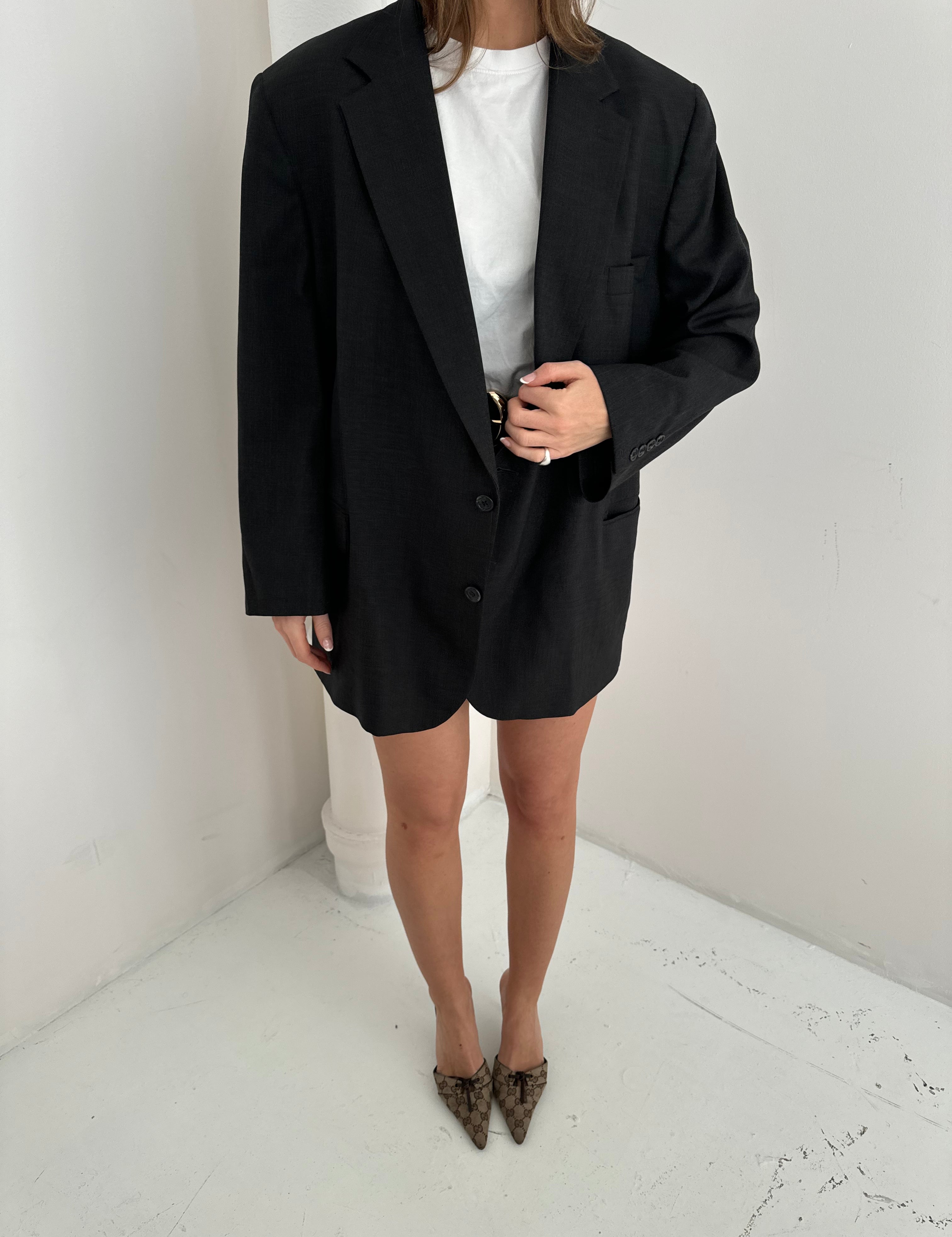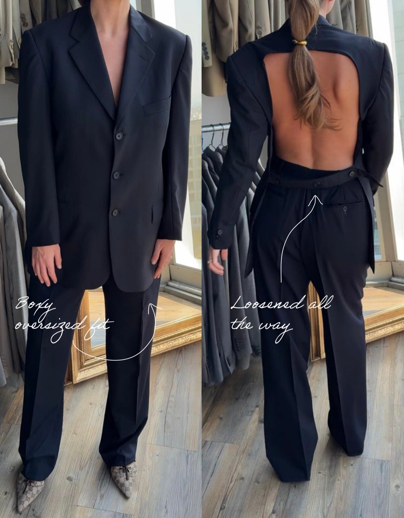 A match made in heaven. Two carefully sourced vintage blazers, made into one, adding a twist to the classic and timeless oversized blazer. Perfect for all occasions and always super versatile. Wear it with jeans or on its own, daytime or evening. Carefully curated, tailored and dry cleaned. Beautiful quality, and always made from silk, cashmere, cotton or wool.The sewing has been done well, however there may be slight differences in length/shoulder, as the jacket is made from two recycled blazers.