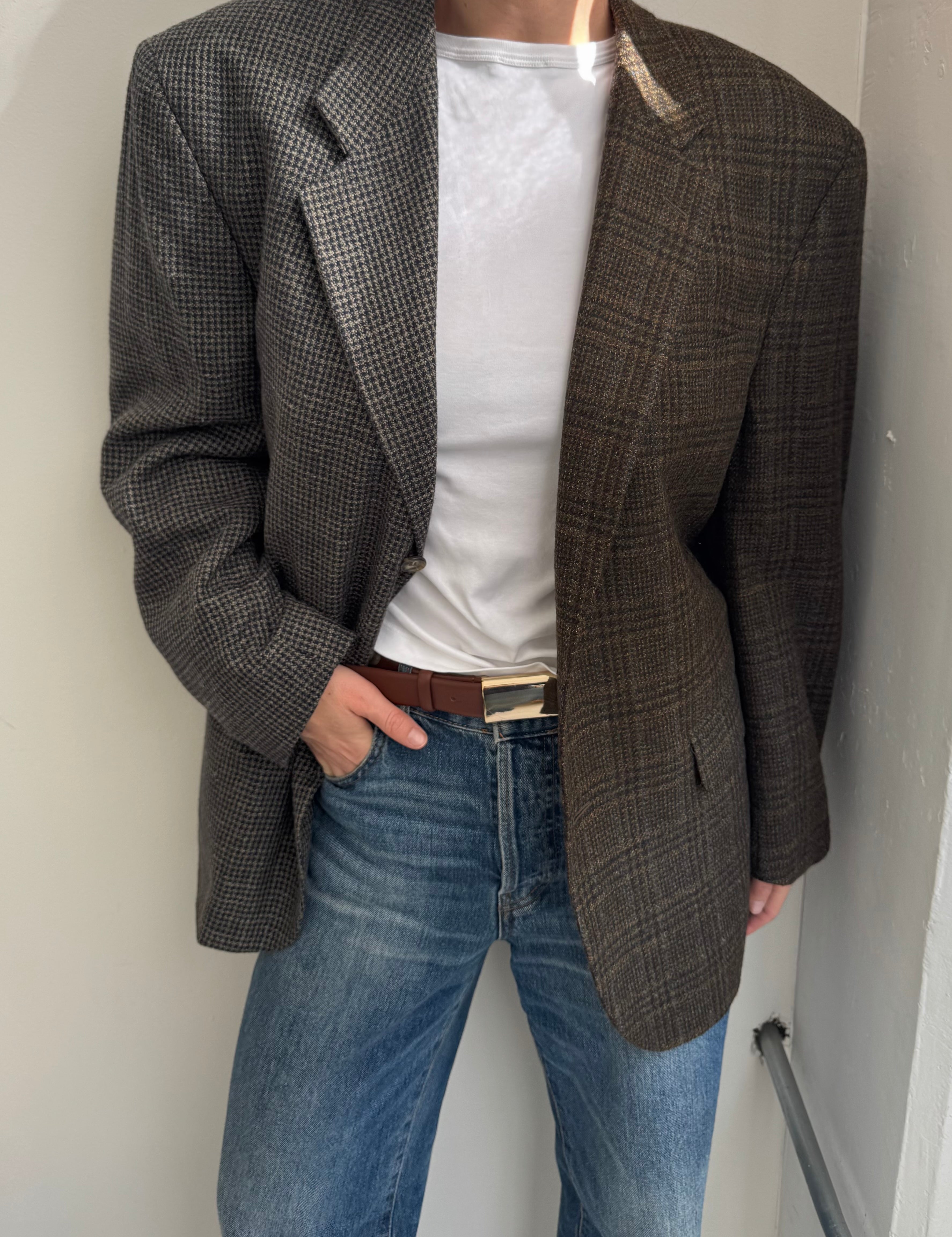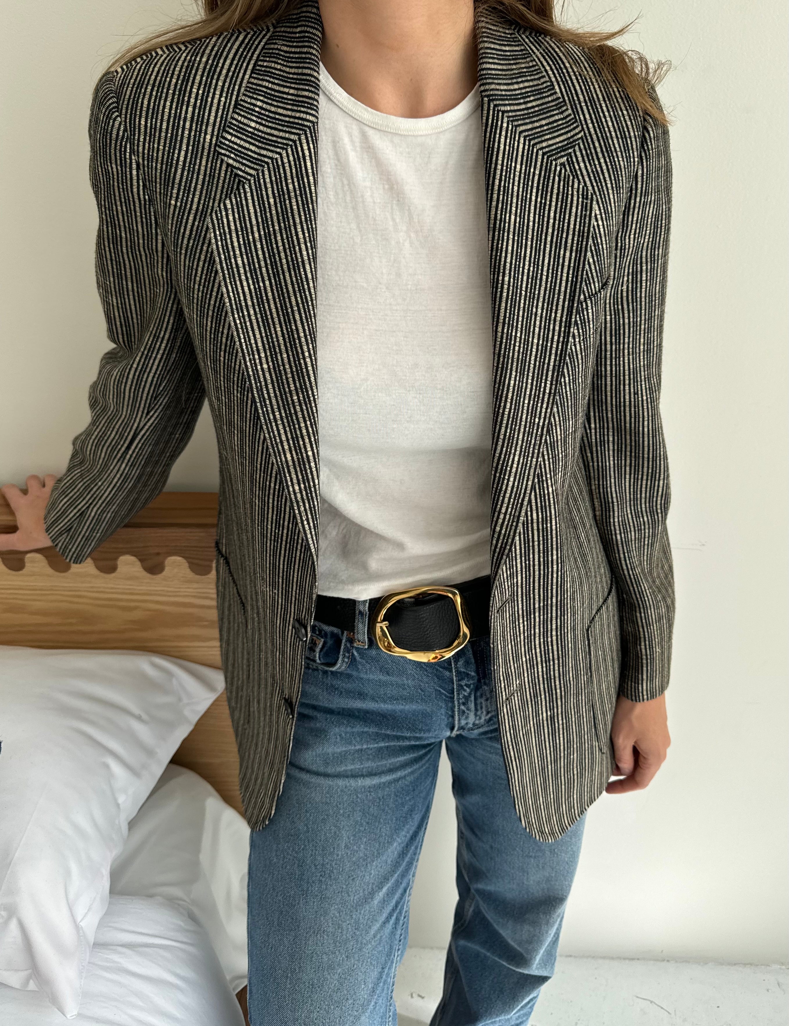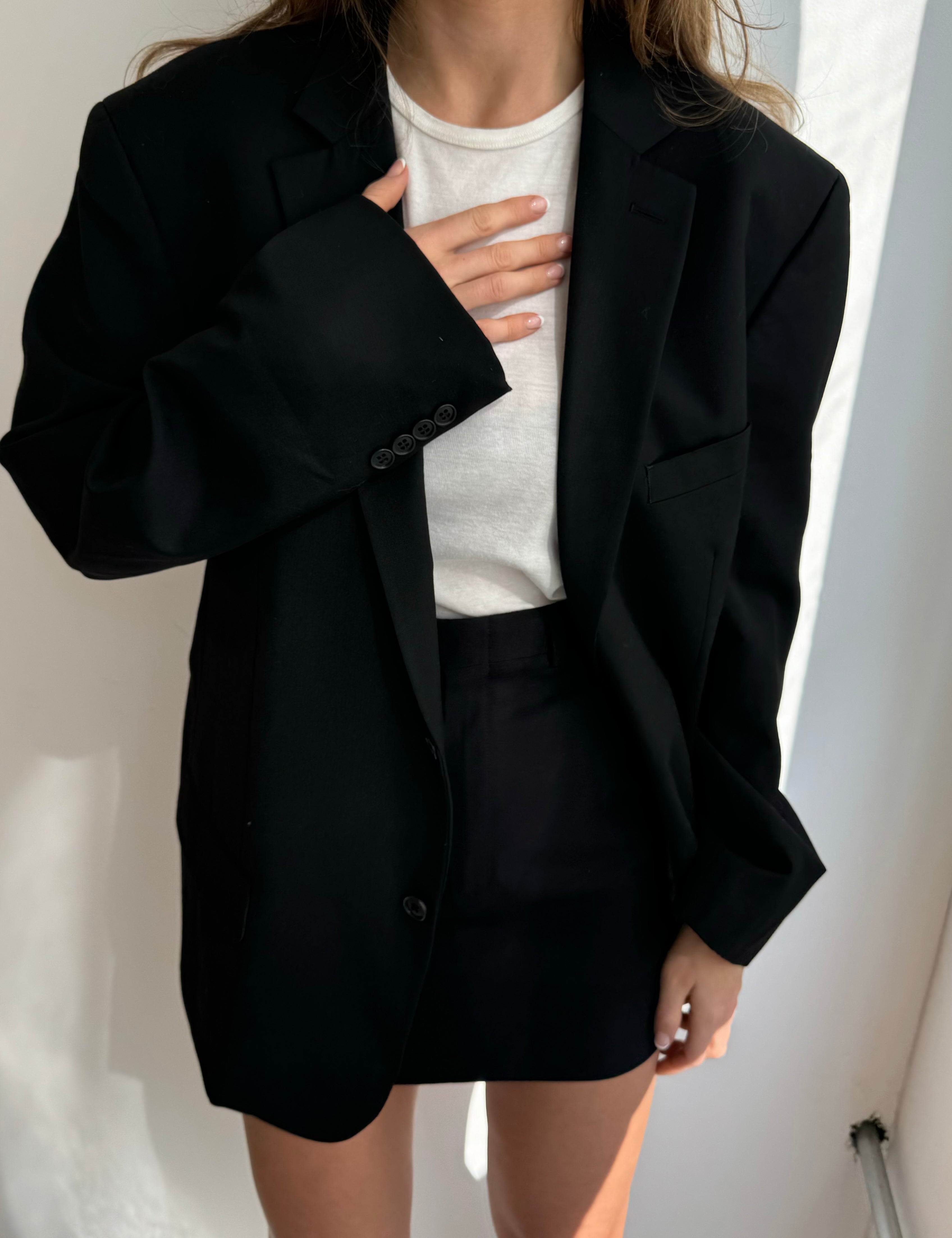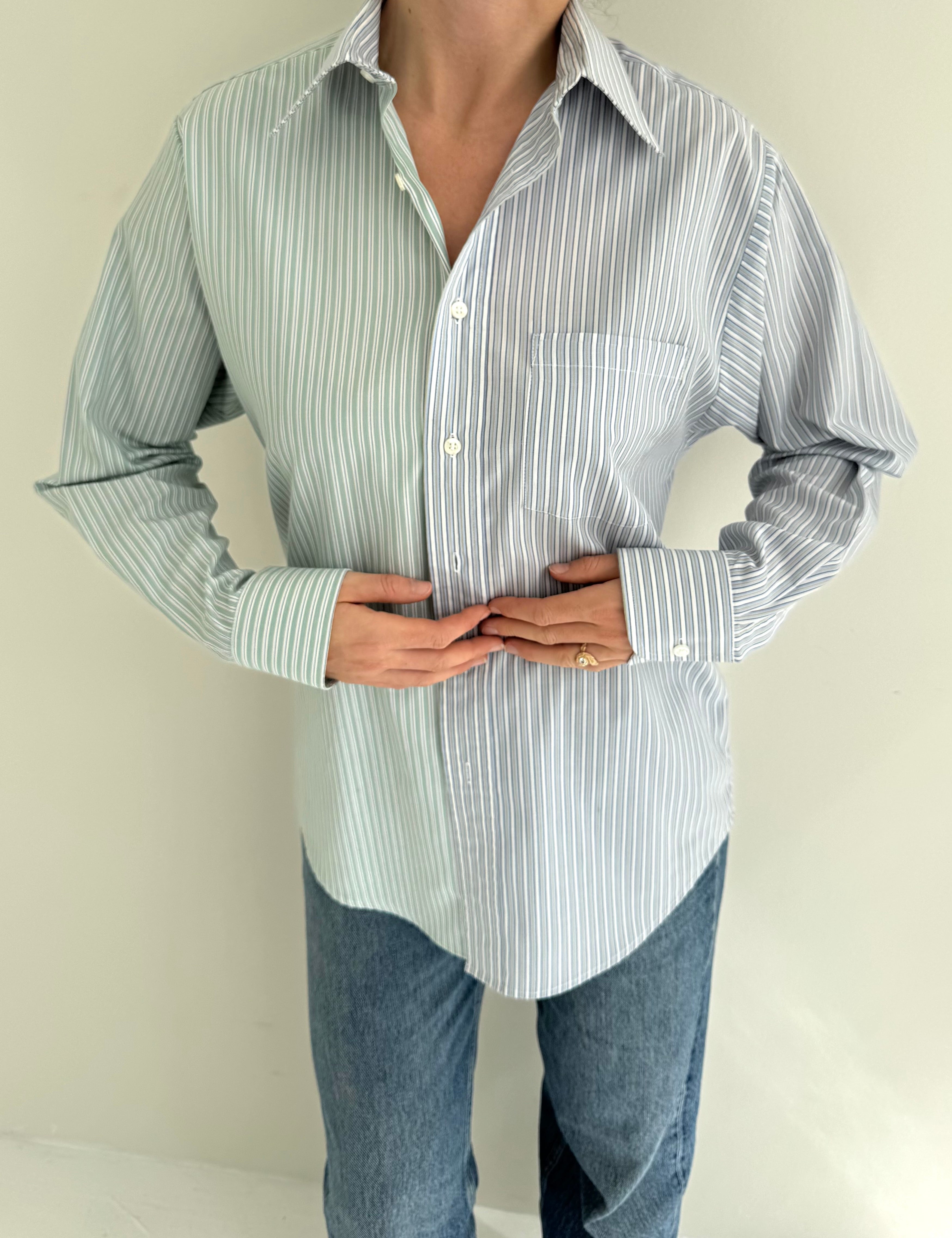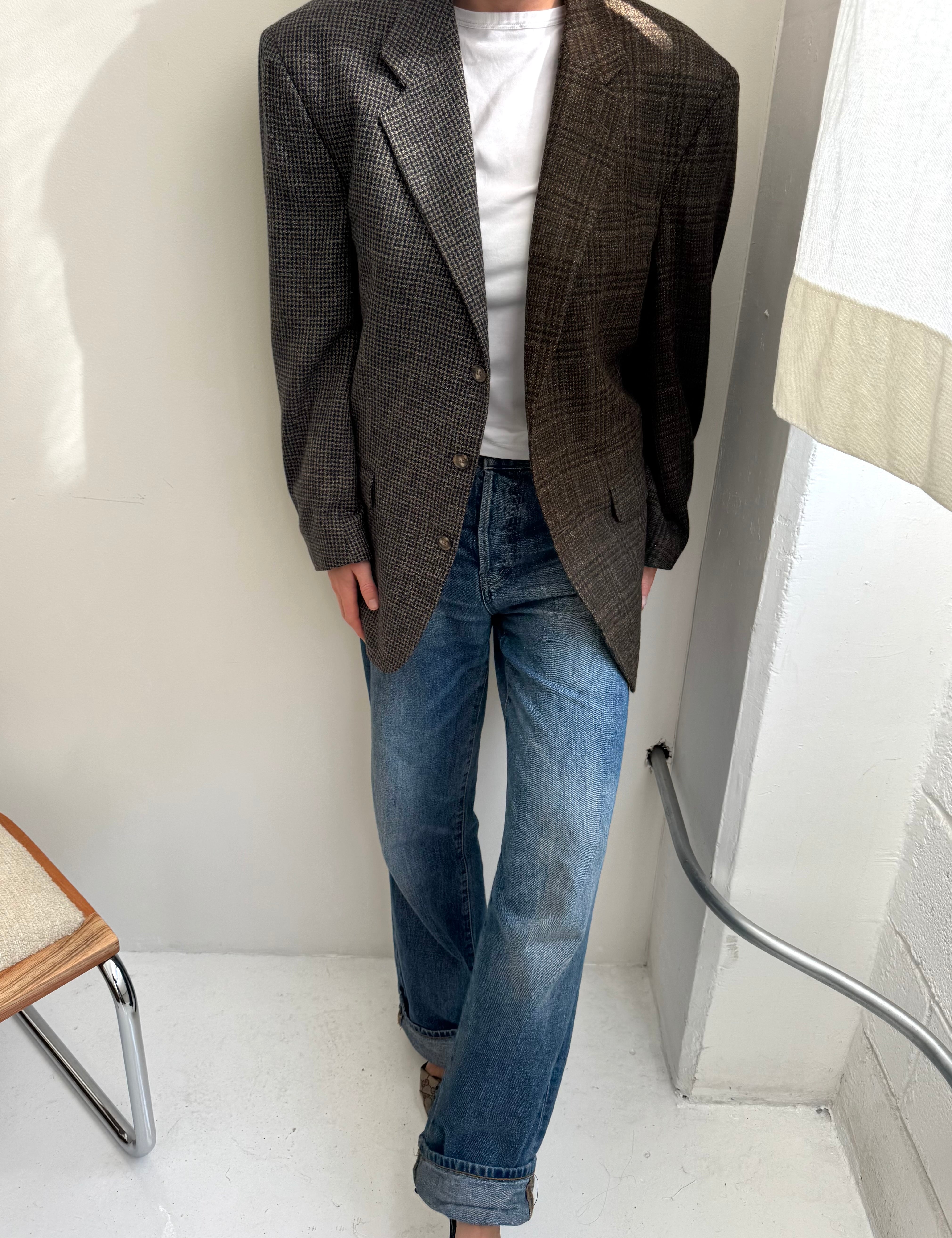 A match made in heaven. Two carefully sourced vintage blazers, made into one, adding a twist to the classic and timeless oversized blazer. Perfect for all occasions and always super versatile. Wear it with jeans or on its own, daytime or evening. Carefully curated, tailored and dry cleaned. Beautiful quality, and always made from silk, cashmere, cotton or wool.The sewing has been done well, however there may be slight differences in length/shoulder, as the jacket is made from two recycled blazers.