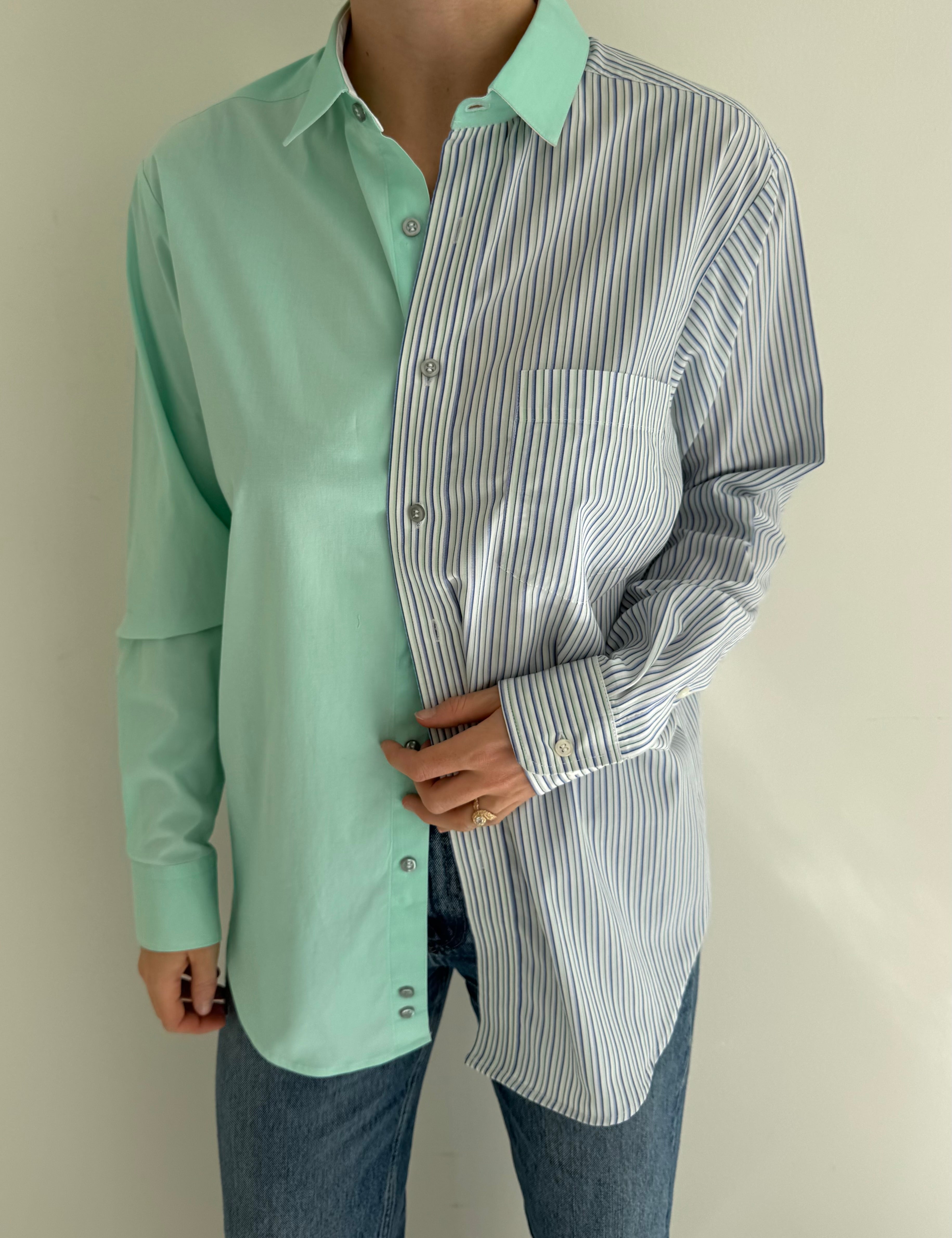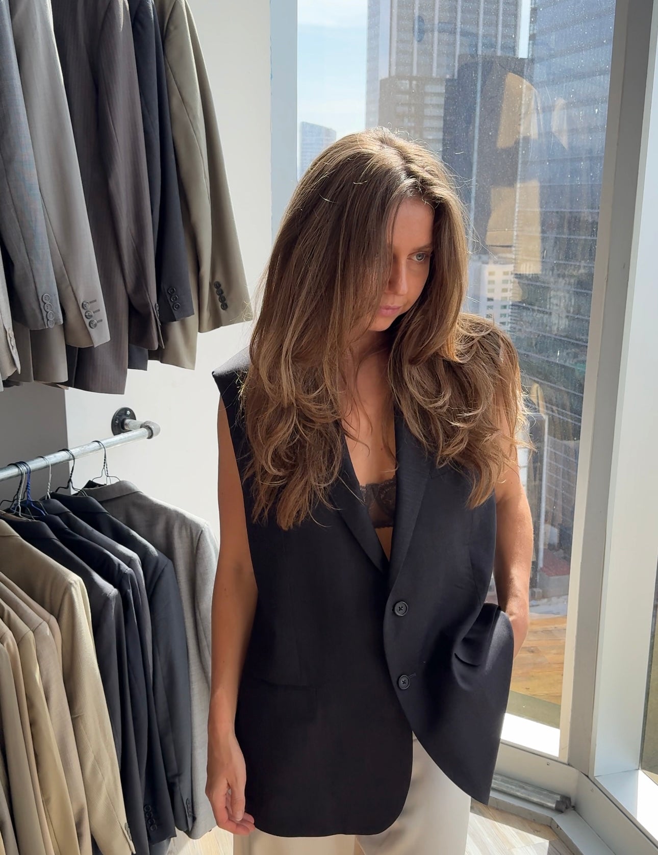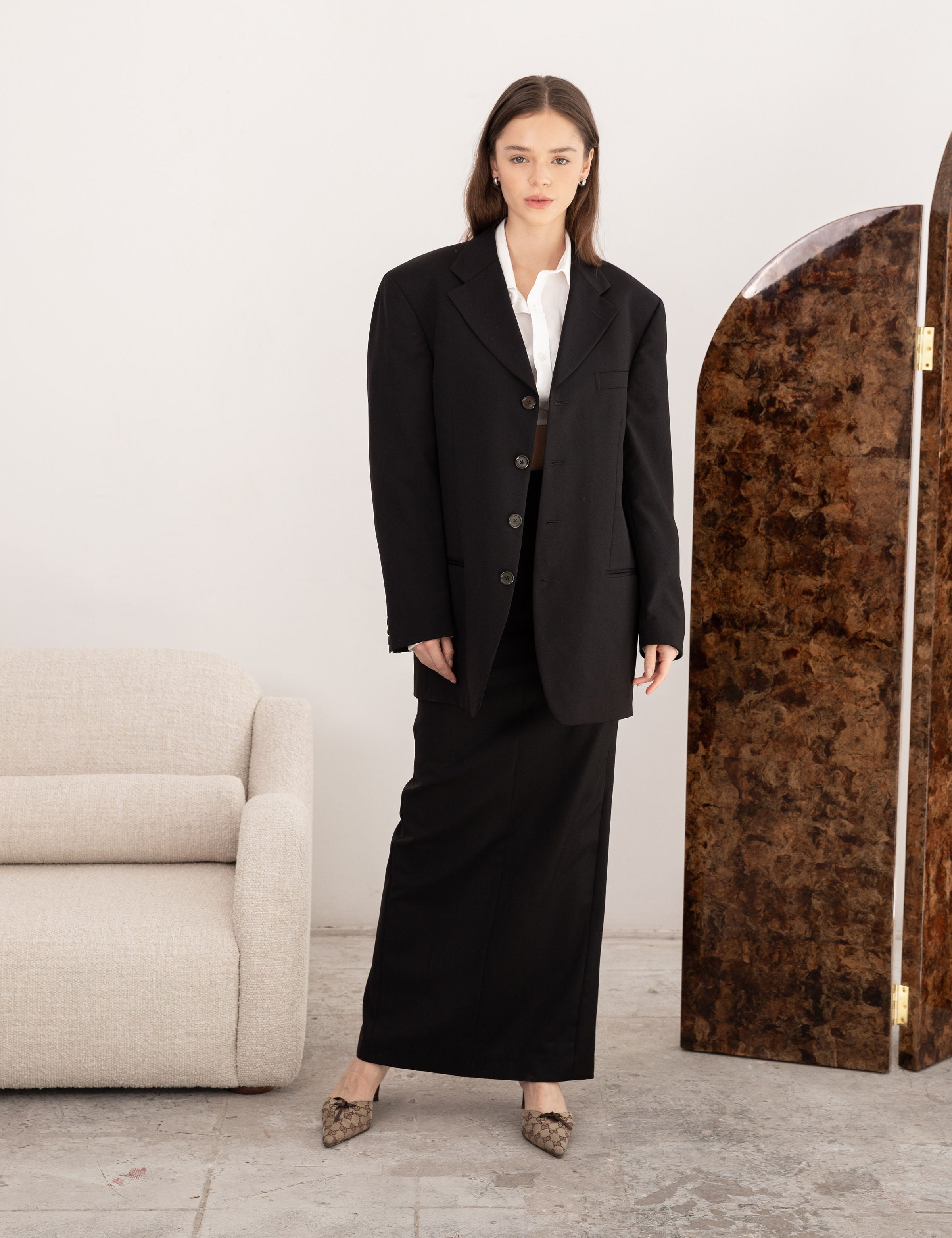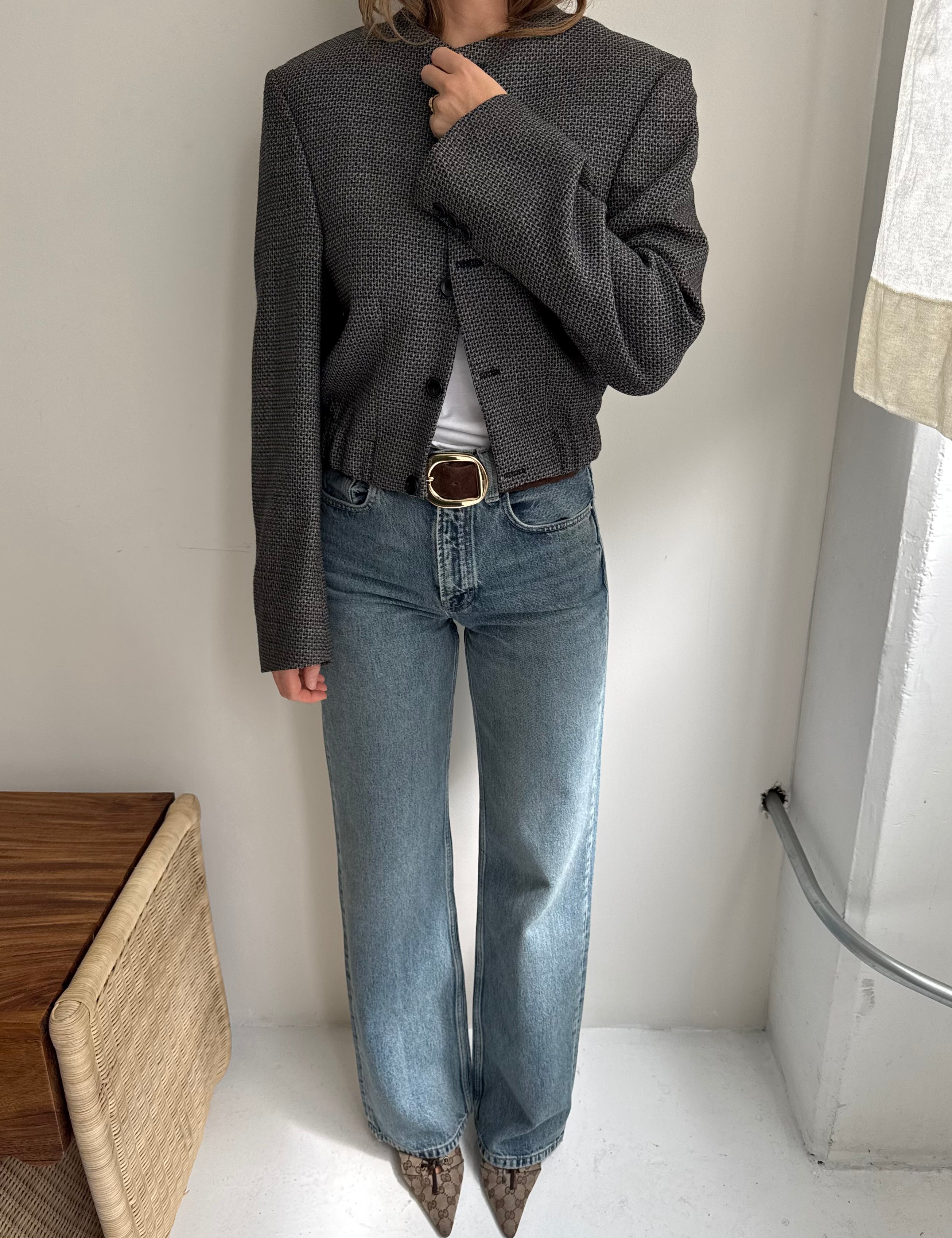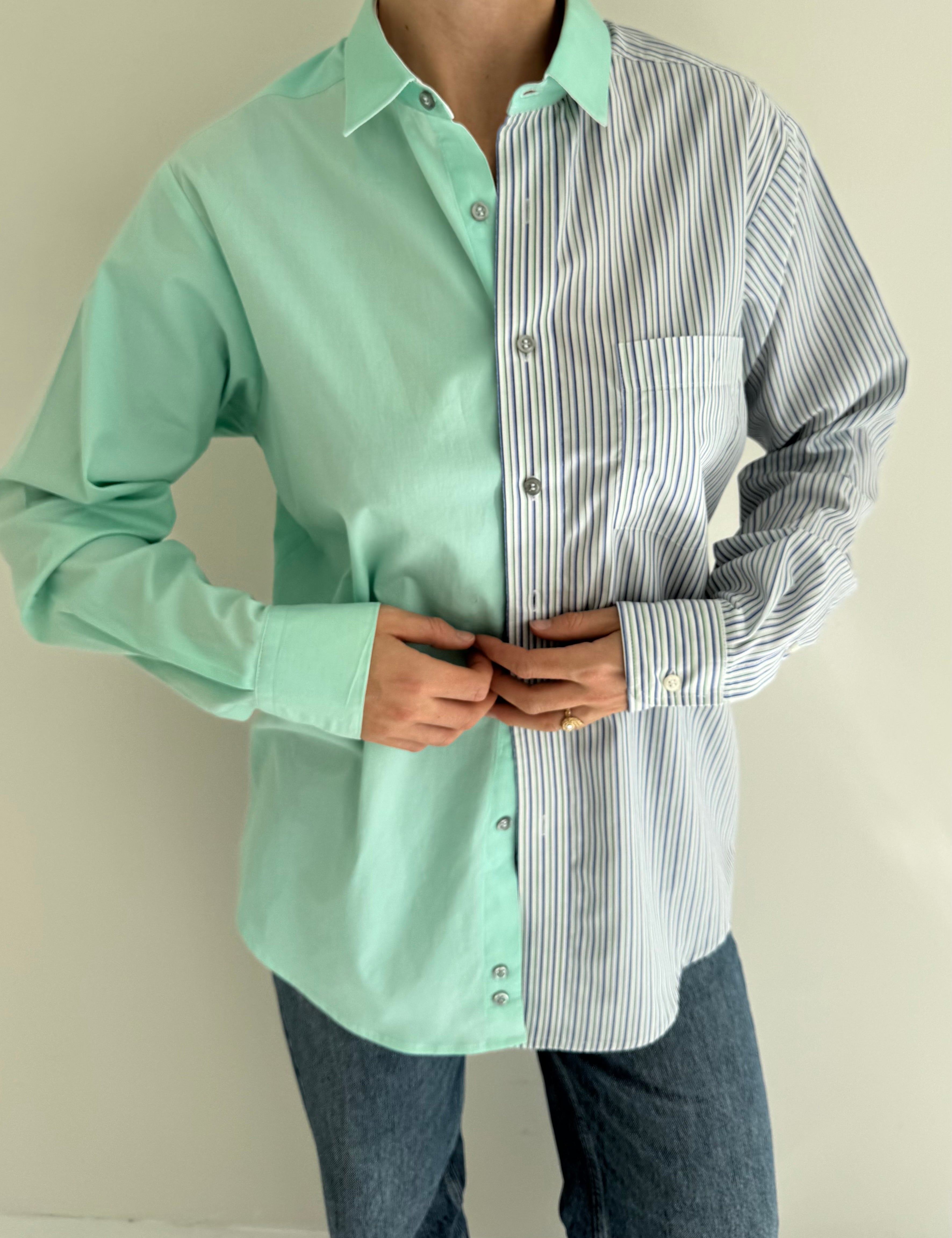 A match made in heaven. Two carefully sourced vintage blazers, made into one, adding a twist to the classic and timeless oversized blazer. Perfect for all occasions and always super versatile. Wear it with jeans or on its own, daytime or evening. Carefully curated, tailored and dry cleaned. Beautiful quality, and always made from silk, cashmere, cotton or wool.The sewing has been done well, however there may be slight differences in length/shoulder, as the jacket is made from two recycled blazers.